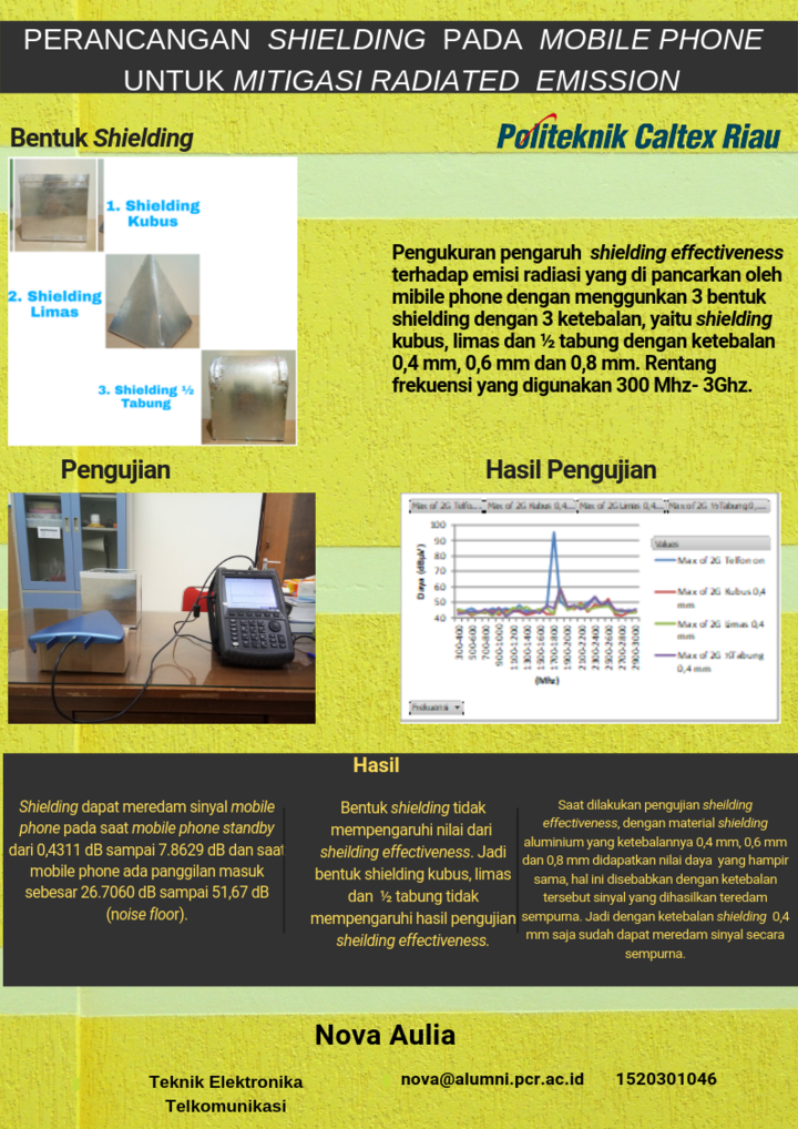 Perangkat mobile phone sering kali mengalami pancaran radiasi yang tidak diinginkan yaitu melebihi batas standar CISPR 22 kelas B, sehingga bisa mengganggu kerja perangkat elektronik di sekitar. Dalam penelitian dilakukan perancangan shielding pada mobile phone. Perancangan shielding yang tepat dapat mengurangi pengaruh radiasi yang dihasilkan oleh suatu perangkat. Pada penelitin ini dilakukan pengujian shielding effectiveness menggunakan antena log periodik pada rentang frekuensi 300 MHz sampai 3 GHz. Shielding yang dibuat yaitu bentuk kubus, limas dan ½ tabung, menggunakan bahan aluminium dengan ketebalan 0,4 mm, 0,6 dan 0,8 mm. Pada pengujian shielding dapat meredam sinyal mobile phone pada saat mobile phone standby sebesar 0,4311 dB sampai 7,8629 dan saat mobile phone ada panggilan masuk sebesar 26,7060 sampai 51,67 dB (noise floor). Ketebalan shielding 0,4 mm sudah dapat meredam sinyal secara sempurna dan bentuk shielding tidak mempengaruhi nilai dari shielding effectiveness.