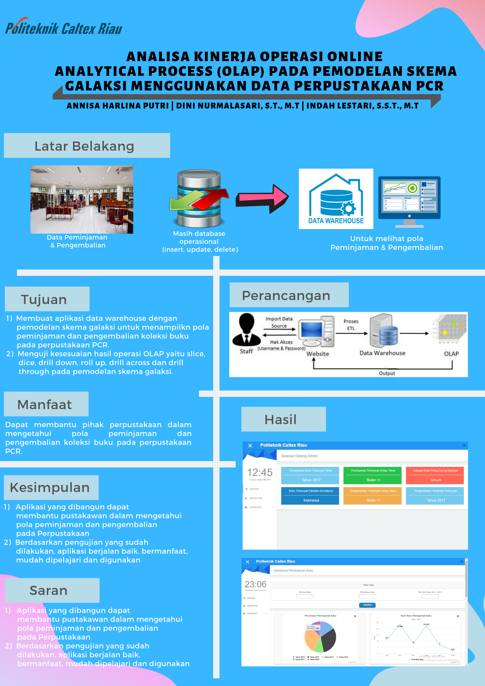 Perpustakaan PCR sebagai satu tempat untuk mencari referensi berbagai ilmu, mulai dari dasar-dasar ilmu bidang teknik hingga pengetahuan umum lainnya dengan koleksi yang terdata mencapai 5.477.618. Saat ini perpustakaan PCR memiliki sistem berupa website berbasis transaksional, yang digunakan untuk menyimpan transaksi harian perpustakaan, seperti input, delete, dan edit data. Agar data tersebut lebih bermanfaat, maka dibangun suatu aplikasi data warehouse dengan menerapkan pemodelan data multidimensi menggunakan seluruh data historical perpustakaan. Pemodelan data warehouse yang digunakan adalah skema galaksi dengan menerapkan operasi OLAP yang divisualisasikan kedalam bentuk dashboard untuk mendapatkan pola peminjaman dan pengembalian pada perpustakaan PCR. Hasil pengujian funcionality menunjukkan bahwa aplikasi sudah sesuai dengan kebutuhan pengguna dan berjalan sesuai fungsinya. Dari hasil pengujian usability, diperoleh hasil yang sangat baik mengenai kemudahan dalam penggunaan aplikasi, mudah dipelajari, memuaskan dan bermanfaat bagi user. Hasil pengujian efficiency diperoleh grade B (baik) untuk rata-rata page speed, grade A (sangat baik) pada Yslow, dan hasil load time 1.9 detik. Dari hasil pengujian tersebut menyatakan bahwa aplikasi yang telah dibangun telah memenuhi standar kualitas ISO 9126.