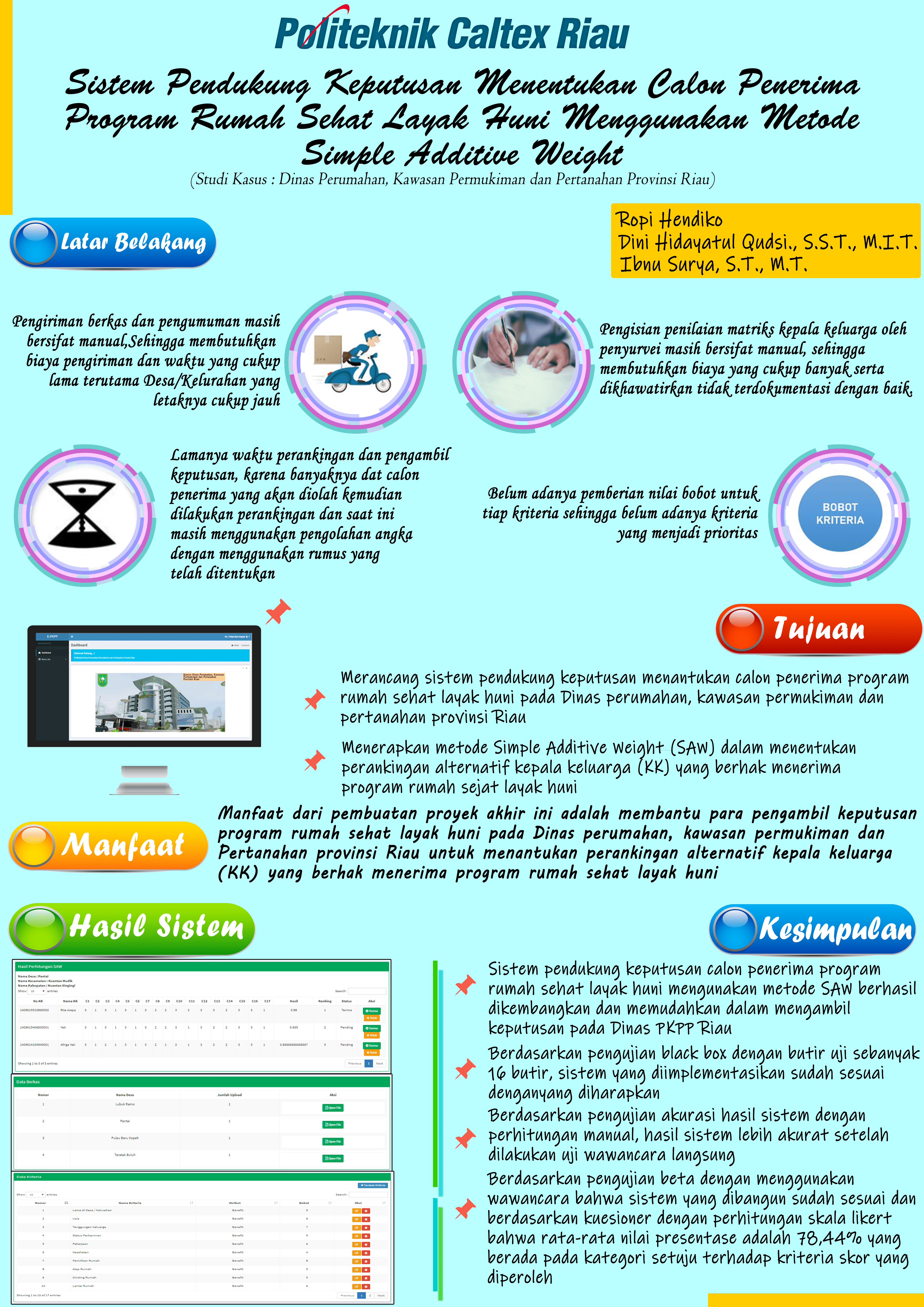 Sistem Pendukung Keputusan Menentukan Calon Penerima Program Rumah Sehat Layak Huni Menggunakan Metode Simple Additive Weight (Studi Kasus : Dinas Perumahan, Kawasan Permukiman dan Pertanahan Provinsi Riau)