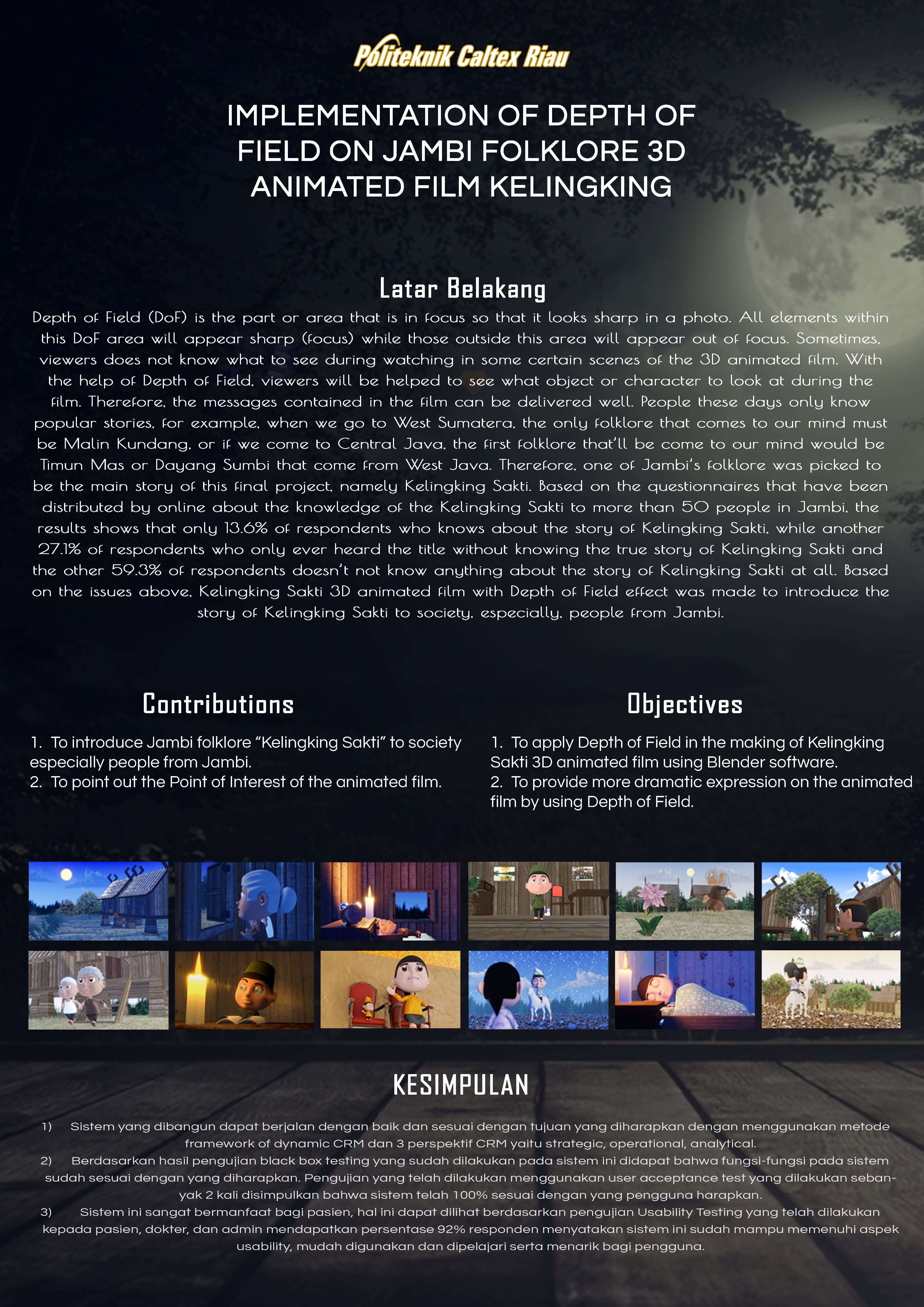 Depth of Field (DoF) is the part or area that is in focus so that it looks sharp in a photo. All elements within this DoF area will appear sharp (focus) while those outside this area will appear out of focus. Sometimes, viewers does not know what to see during watching in some certain scenes of the 3D animated film. With the help of Depth of Field, viewers will be helped to see what object or character to look at during the film. Therefore, the messages contained in the film can be delivered well. People these days only know popular stories, for example, when we go to West Sumatera, the only folklore that comes to our mind must be Malin Kundang, or if we come to Central Java, the first folklore that’ll be come to our mind would be Timun Mas or Dayang Sumbi that come from West Java. Therefore, one of Jambi’s folklore was picked to be the main story of this final project, namely Kelingking Sakti. Based on the questionnaires that have been distributed by online about the knowledge of the Kelingking Sakti to more than 50 people in Jambi, the results shows that only 13.6% of respondents who knows about the story of Kelingking Sakti, while another 27.1% of respondents who only ever heard the title without knowing the true story of Kelingking Sakti and the other 59.3% of respondents doesn’t know anything about the story of Kelingking Sakti at all. Based on the issues above, Kelingking Sakti 3D animated film with Depth of Field effect was made to introduce the story of Kelingking Sakti to society, especially, people from Jambi.