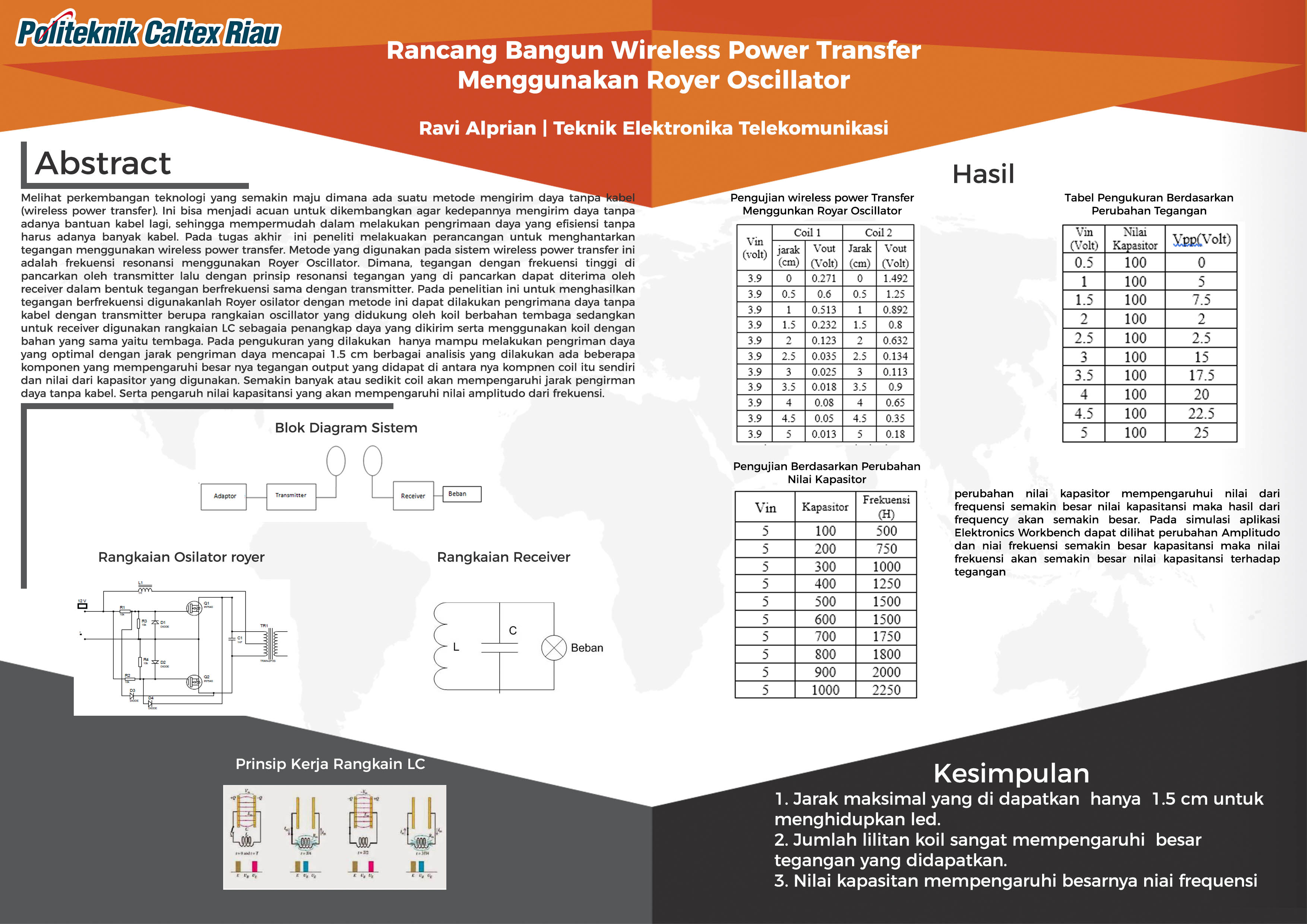Melihat perkembangan teknologi yang semakin maju dimana ada suatu metode mengirim daya tanpa kabel (wireless power transfer). Ini bisa menjadi acuan untuk dikembangkan agar kedepannya mengirim daya tanpa adanya bantuan kabel lagi, sehingga mempermudah dalam melakukan pengrimaan daya yang efisiensi tanpa harus adanya banyak kabel. Pada tugas akhir ini peneliti melakuakan perancangan untuk menghantarkan tegangan menggunakan wireless power transfer. Metode yang digunakan pada sistem wireless power transfer ini adalah frekuensi resonansi menggunakan Royer Oscillator. Dimana, tegangan dengan frekuensi tinggi di pancarkan oleh transmitter lalu dengan prinsip resonansi tegangan yang di pancarkan dapat diterima oleh receiver dalam bentuk tegangan berfrekuensi sama dengan transmitter. Pada penelitian ini untuk menghasilkan tegangan berfrekuensi digunakanlah Royer osilator dengan metode ini dapat dilakukan pengrimana daya tanpa kabel dengan transmitter berupa rangkaian oscillator yang didukung oleh koil berbahan tembaga sedangkan untuk receiver digunakan rangkaian LC sebagaia penangkap daya yang dikirim serta menggunakan koil dengan bahan yang sama yaitu tembaga. Pada pengukuran yang dilakukan hanya mampu melakukan pengriman daya yang optimal dengan jarak pengriman daya mencapai 1.5 cm berbagai analisis yang dilakukan ada beberapa komponen yang mempengaruhi besar nya tegangan output yang didapat di antara nya kompnen coil itu sendiri dan nilai dari kapasitor yang digunakan. Semakin banyak atau sedikit coil akan mempengaruhi jarak pengirman daya tanpa kabel. Serta pengaruh nilai kapasitansi yang akan mempengaruhi nilai amplitudo dari frekuensi.