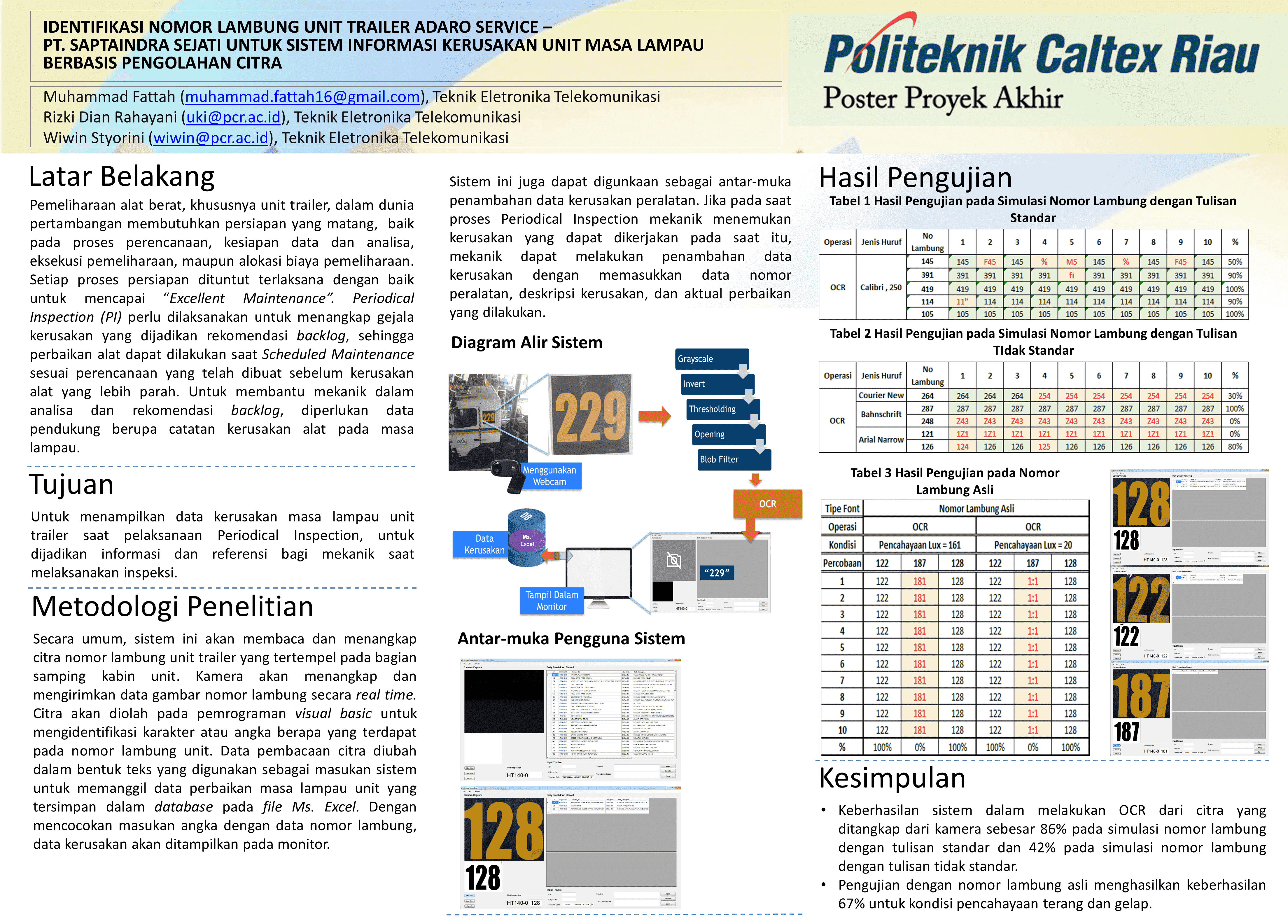 Pemeliharaan alat berat, khususnya unit trailer, dalam dunia pertambangan membutuhkan persiapan yang matang, baik pada proses perencanaan, kesiapan data dan analisa, eksekusi pemeliharaan, maupun alokasi biaya pemeliharaan. Setiap proses persiapan dituntut terlaksana dengan baik untuk mencapai “Excellent Maintenanceâ€. Untuk menekan biaya dan waktu pemeliharaan yang sangat tinggi akibat banyaknya kerusakan alat yang tidak terprediksi, maka proses Periodical Inspection (PI) perlu dilaksanakan. PI bertujuan unuk menangkap gejala kerusakan yang dijadikan rekomendasi backlog, sehingga perbaikan alat dapat dilakukan saat Scheduled Maintenance sesuai perencanaan yang telah dibuat sebelum kerusakan alat yang lebih parah. Untuk membantu mekanik dalam analisa dan rekomendasi backlog, diperlukan data pendukung berupa catatan kerusakan alat pada masa lampau. Hal ini yang menjadi latar belakang diajukannya tugas akhir yang berjudul “Identifikasi Nomor Lambung Unit Trailer Adaro Service – PT. Saptaindra Sejati Untuk Sistem Informasi Kerusakan Unit Masa Lampau Berbasis Pengolahan Citraâ€. Dimana menggunakan metode Optical Character Recognition (OCR), data akan disajikan dengan memproses citra nomor lambung pada unit dan ditampikan pada monitor dengan antar-muka visual basic. Data yang ditampilkan bersumber dari database Breakdown Unschedule unit trailer yang pernah terjadi selama unit beroperasi. Hasil keberhasilan sebesar 84% untuk model tulisan standar, 42% untuk model tulisan tidak standar, dan 67% dengan nomor lambung asli.
