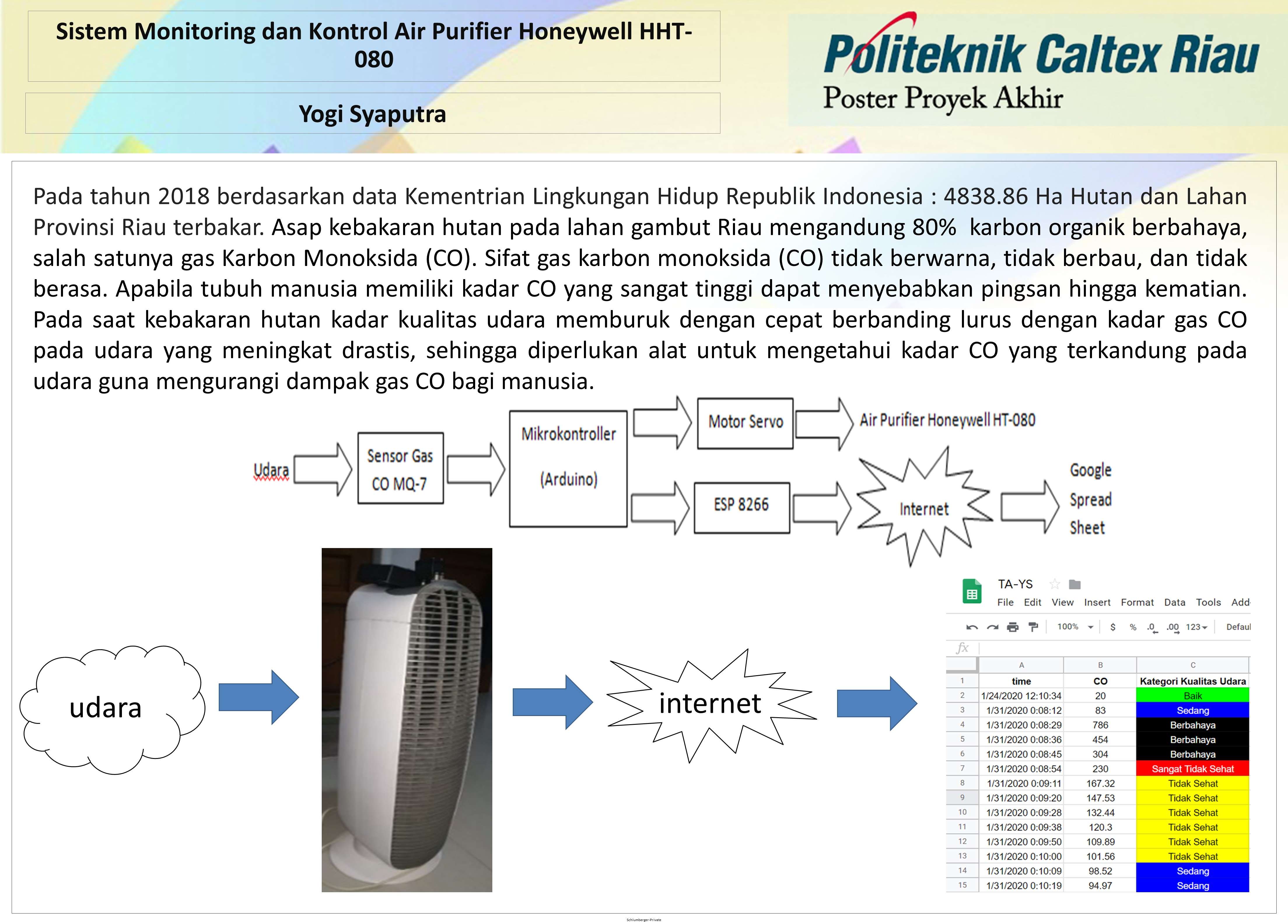 Udara sangat penting bagi keberlangsungan makhluk hidup, kualitas udara akan mempengaruhi keadaan kesehatan manusia tersebut. Pada saat ini kualitas udara hanya dipantau oleh KLH (Kementrian Lingkungan Hidup) Provinsi Riau, dengan titik pantau hanya 1-3 titik setiap kota / kabupatan di Riau. Seringnya terjadi kebakaran hutan di Riau, menyebabkan kualitas udara memburuk dengan cepat sehingga memerlukan alat yang dapat memantau kualitas udara dan memperbaiki kualitas udara guna menjaga kesehatan manusia. Oleh karena itu penulis melakukan penelitian dan perancangan alat untuk dapat memantau (monitoring) kualitas udara (kadar gas CO) dan memperbaiki kualitas udara pada ruangan tersebut. Cara kerja dari perangkat monitoring ini adalah sensor gas MQ-7 mengukur kadar gas CO (karbon monoksida), dimana datanya kemudian diolah dan dikirimkan melalui jaringan wi-fi menggunakan ESP8266 serta datanya juga dijadikan acuan untuk bekerja atau tidaknya air purifier pada ruangan. Hasil monitoring ini dibagikan menggunakan google spreadsheet melalui e-mail kepada orang-orang yang bersangkutan. Sensor MQ-7 bekerja terbaik pada range 50-150 ppm gas karbon monoksida dengan deviasi 14 ppm dari multi gas detektor yang terkalibrasi.