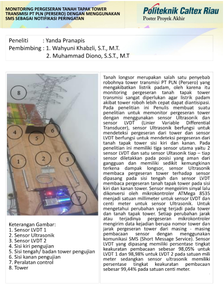 Tanah longsor merupakan salah satu penyebab robohnya tower transmisi PT PLN (Persero) yang mengakibatkan listrik padam, oleh karena itu monitoring pergeseran tanah tapak tower transmisi sangat diperlukan agar listrik padam akibat tower roboh lebih cepat dapat diantisipasi. Pada penelitian ini Penulis membuat suatu penelitian untuk memonitor pergeseran tower dengan menggunakan sensor Ultrasonik dan sensor LVDT (Linier Variable Differential Transducer), sensor Ultrasonik berfungsi untuk mendeteksi pergeseran dari tower dan sensor LVDT berfungsi untuk mendeteksi pergeseran dari tanah tapak tower sisi kiri dan kanan. Pada penelitian ini memiliki tiga sensor utama yaitu 2 sensor LVDT dan satu sensor Ultasonik tiap – tiap sensor diletakkan pada posisi yang aman dari gangguan dan memiliki sedikit kemungkinan terkena dampak longsor, sensor Ultrasonik membaca pergeseran tower terhadap sensor dipasang pada sisi tengah dan sensor LVDT membaca pergeseran tanah tapak tower pada sisi kiri dan kanan tower. Sensor mengirim sinyal lalu dikonversi oleh mikrokontroler ATMega 8535 menjadi satuan millimeter untuk sensor LVDT dan centi meter untuk sensor Ultrasonik. Untuk mengetahui perubahan yang terjadi pada tower dan tanah tapak tower. Setiap perubahan jarak atau terjadinya pergeseran mikrokontroler mengirim data kejadian berupa nomor tower dan jarak pergeseran tower dari masing - masing pembacaan sensor dengan menggunakan komunikasi SMS (Short Message Service). Sensor LVDT yang dipasang memiliki persentase tingkat keakuratan pembacaan sebesar 98,05% untuk LVDT 1 dan 98,98% untuk LVDT 2 pada satuan mili meter sedangkan sensor ultrasonik memiliki persentase tingkat keakuratan pembacaan sebesar 99,44% pada satuan centi meter.