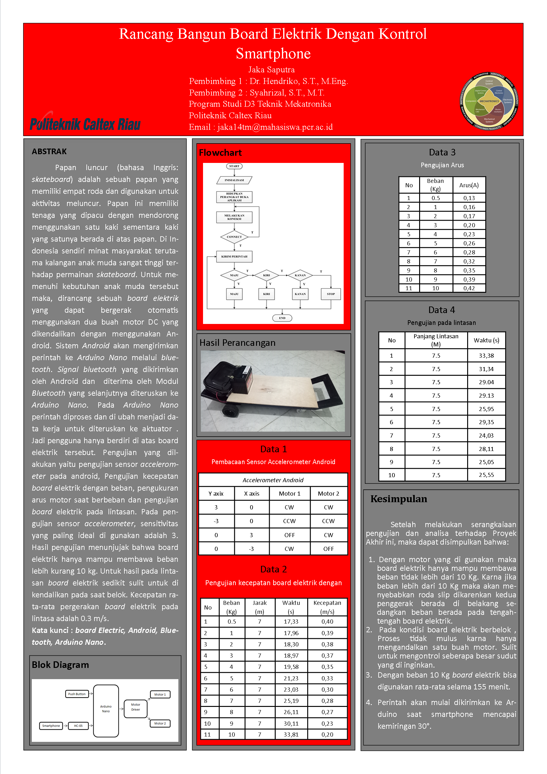 Papan luncur (bahasa Inggris: skateboard) adalah sebuah papan yang memiliki empat roda dan digunakan untuk aktivitas meluncur. Papan ini memiliki tenaga yang dipacu dengan mendorong menggunakan satu kaki sementara kaki yang satunya berada di atas papan. Di Indonesia sendiri minat masyarakat terutama kalangan anak muda sangat tinggi terhadap permainan skateboard. Untuk memenuhi kebutuhan anak muda tersebut maka, dirancang sebuah board elektrik yang dapat bergerak otomatis menggunakan dua buah motor DC yang dikendalikan dengan menggunakan Android. Sistem Android akan mengirimkan perintah ke Arduino Nano melalui bluetooth. Signal bluetooth yang dikirimkan oleh Android dan diterima oleh Modul Bluetooth yang selanjutnya diteruskan ke Arduino Nano. Pada Arduino Nano perintah diproses dan di ubah menjadi data kerja untuk diteruskan ke aktuator. Jadi pengguna hanya berdiri di atas board elektrik tersebut. Pengujian yang dilakukan yaitu pengujian sensor accelerometer pada android, Pengujian kecepatan board elektrik dengan beban, pengukuran arus motor saat berbeban dan pengujian board elektrik pada lintasan. Pada pengujian sensor accelerometer, sensitivitas yang paling ideal di gunakan adalah 3. Hasil pengujian menunjujak bahwa board elektrik hanya mampu membawa beban lebih kurang 10 kg. Untuk hasil pada lintasan board elektrik sedikit sulit untuk di kendalikan pada saat belok. Kecepatan rata-rata pergerakan board elektrik pada lintasa adalah 0.3 m/s.