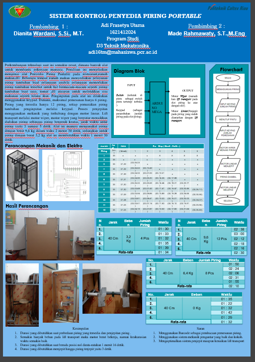 Perkembangan teknologi saat ini semakin pesat, dimana banyak alat untuk membantu pekerjaan manusia. Penulisan ini menjelaskan mengenai alat Penyedia Piring Portable pada restaurant,rumah makan,dll. Beberapa tempat rumah makan menyediakan pelayanan piring tambahan buat pelanggan apabila pelanggan memerlukan piring tambahan tersebut untuk hal bermacam-macam seperti piring tambahan buat saus, tomat ,dll ataupun untuk meletakkan sisa makanan seperti tulang ikan. Penginputan pada alat ini dilakukan menggunakan keypad. Dimana, maksimal pemesanan hanya 6 piring. Piring yang tersedia hanya 12 piring, setiap pemasukan piring tambahan penginputan melalui keypad. Proses penjepitan menggunakan mekanik yang terhubung dengan motor linear. Lift transport melalui motor wiper, motor wiper yang berputar menaikkan dudukan piring sehingga piring bergerak keatas, jarak waktu antar piring yaitu 3 sampai 5 detik. Alat ini mampu mengangkat piring dengan berat 9,6 kg dalam waku 2 menit 30 detik, sedangkan untuk piring dengan berat 3,2 kg alat ini membutuhkan waktu 1 menit 30 detik.