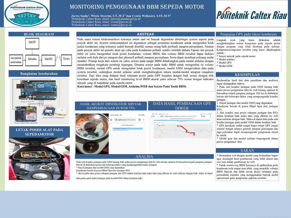 Pada suatu sistem telekomunikasi tentunya untuk saat ini banyak digunakan diberbagai system seperti pada proyek akhir ini. System telekomunikasi ini digunakan sebagai pemantau kendaraan untuk mengetahui letak posisi kendaraan yang tentunya sudah banyak dimiliki semua orang baik peribadi maupun perusahaan. Pada proyek akhir ini penulis akan membahas sistem telekomunikasi pada kendaraan, yaitu “monitoring penggunaan BBM pada kendaraan bermotorâ€. Dimana pada saat ini banyak juga kemungkinan terjadinya kejahatan pada orang yang tidak bertanggung jawab seperti pencurian kendaraan itu sendiri, maupun tidak menutup kemungkinan pada driver yang tidak bertanggung jawab suatu perusahaan untuk memainkan(mencuri) BBM pada kendaraan operasional tersebut. Apalagi untuk saat ini juga diketahui harga BBM tersebut pun semangkin melonjak naik(mahal).Maka dari itu dibuatnya system proyek akhir ini untuk mengurangi atau meminimalisir terjadinya kejahatan tersebut, baik dari pencurian kendaraan itu sendiri maupun dari BBM pada kendaraan tersebut. Dengan system pemantauan untuk kendaraan maupun BBM pada kenderaan tersebut. Namun pada proyek akhir ini penulis akan uji coba pada kendaraan pribadi sendiri terlebih dahulu.Tujuan inti proyek akhir ini yaitu mengetahui letak posisi kendaraan, volume BBM, dan volume BBM tersebut dapat diakses melalui web baik dari pc ataupun dari phonsell pribadi maupun perusahaan. Serta dapat membuat peluang usaha mandiri. Prinsip kerja dari sistem ini yaitu, sensor pada tangki BBM dihubungkan pada modul arduino dengan menambahkan rangakain pembagi tegangan. Dimana sensor pada tanki BBM untuk mengetahui isi volume BBM tersebut, modul GPS untuk mengetahui letak posisi kendaraan, modul GSM mengirimkan data pada system tersebut, sedangkan modul arduino untuk menghubungkan antara modul-modul ataupun rangakain tersebut. Dari data yang didapat hasil rekaman posisi pada GPS berjalan dengan baik sesuai dengan titik koordinat sepeda motor, dan hasil monitoring level BBM akurat yaitu sebesar 25% sesuai dengan indicator minyak yang di tunjukkan pada sepeda motor.