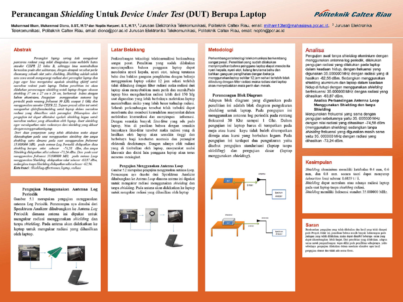 Perangkat laptop sering kali mengalami pancaran radiasi yang tidak diinginkan yaitu melebihi batas standar CISPR 22 kelas B, sehingga bisa menimbulkan kerusakan pada alat berupa laptop dan perangkat laptop yang ada disekitar ruangan, maka dirancang sebuah alat berbentuk kubus yaitu shielding. Shielding adalah salah satu cara untuk mengurangi radiasi dari perangkat laptop dan juga agar bisa mengetahui apakah shielding efektif untuk meredam rediasi pada laptop. Dalam penelitian ini akan dilakukan perancangan shielding untuk laptop dengan ukuran shielding 37 cm x 27 cm x 26 cm dengan bentuk kubus dari bahan aluminium. Pengujian menggunakan antena log periodik pada rentang frekuensi 30 KHz sampai 1 GHz dan menggunakan standar CISPR 22. Tujuan proyek akhir ini untuk mengetahui efektifitas shielding untuk laptop dalam meredam radiasi yang dihasilkan oleh perangkat. Diharapkan dari pengujian ini dapat diketahui apakah shielding bagus untuk meredam radiasi yang dihasilkan oleh laptop. Buat shielding agar mendapatkan nilai radiasinya dari shielding yang dibuat dengan menggunakan laptop. Dari data pengerjaan yang telah dilakukan maka dapat dibandingkan pada saat menggunakan shielding dan tanpa shielding yaitu dimana pada saat menggunakan frekuensi 35 MHz pada antena Log Periodik didapatkan data shielding berupa nilai sebesar -74,58 dBμv, tanpa Shielding didapatkan nilai sebesar -73,24 dBμv. Dan pada saat menggunakan frekuensi 35 MHz pada antena Loop menggunakan Shielding didapatkan nilai sebesar -63,87 dBμv, sedangkan tanpa Shielding didapatkan nilai sebesar -62,56.