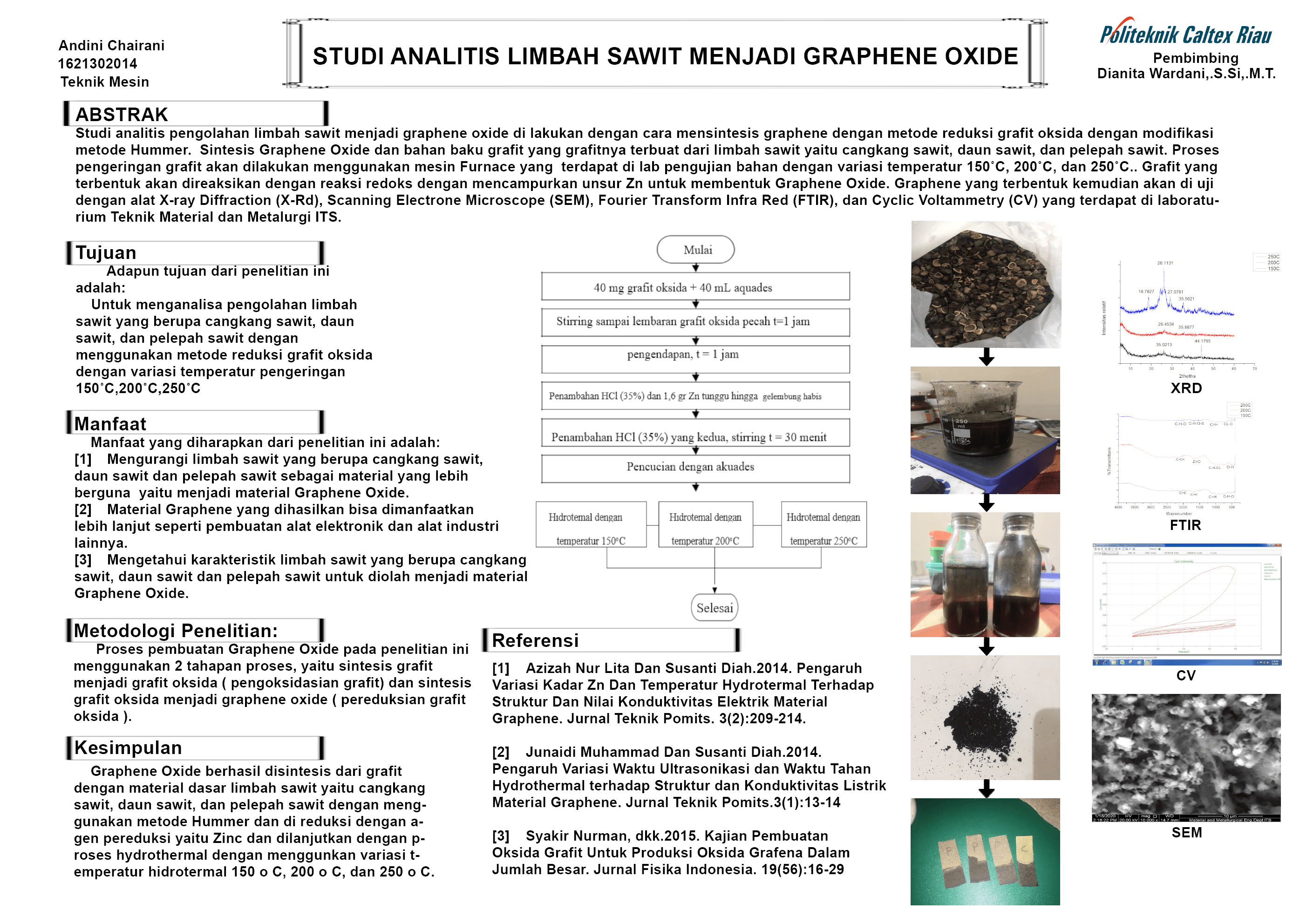 Studi analitis pengolahan limbah sawit menjadi graphene oxide di lakukan dengan cara mensintesis graphene dengan metode reduksi grafit oksida dengan modifikasi metode Hummer. Sintesis Graphene Oxide dan bahan baku grafit yang grafitnya terbuat dari limbah sawit yaitu cangkang sawit, daun sawit, dan pelepah sawit. Proses pengeringan grafit akan dilakukan menggunakan mesin Furnace yang terdapat di lab pengujian bahan dengan variasi temperatur 150ËšC, 200ËšC, dan 250ËšC. Proses sintesis tersebut akan dilakukan dengan variasi waktu sintesis selama 6 jam, 8 jam, dan 12 jam. Grafit yang terbentuk akan direaksikan dengan reaksi redoks dengan mencampurkan unsur Zn untuk membentuk Graphene Oxide. Graphene yang terbentuk kemudian akan di uji dengan alat X-ray Diffraction (X-Rd), Scanning Electrone Microscope (SEM), Fourier Transform Infra Red (FTIR), dan Cyclic Voltammetry (CV) yang terdapat di laboraturium Teknik Material dan Metalurgi ITS.