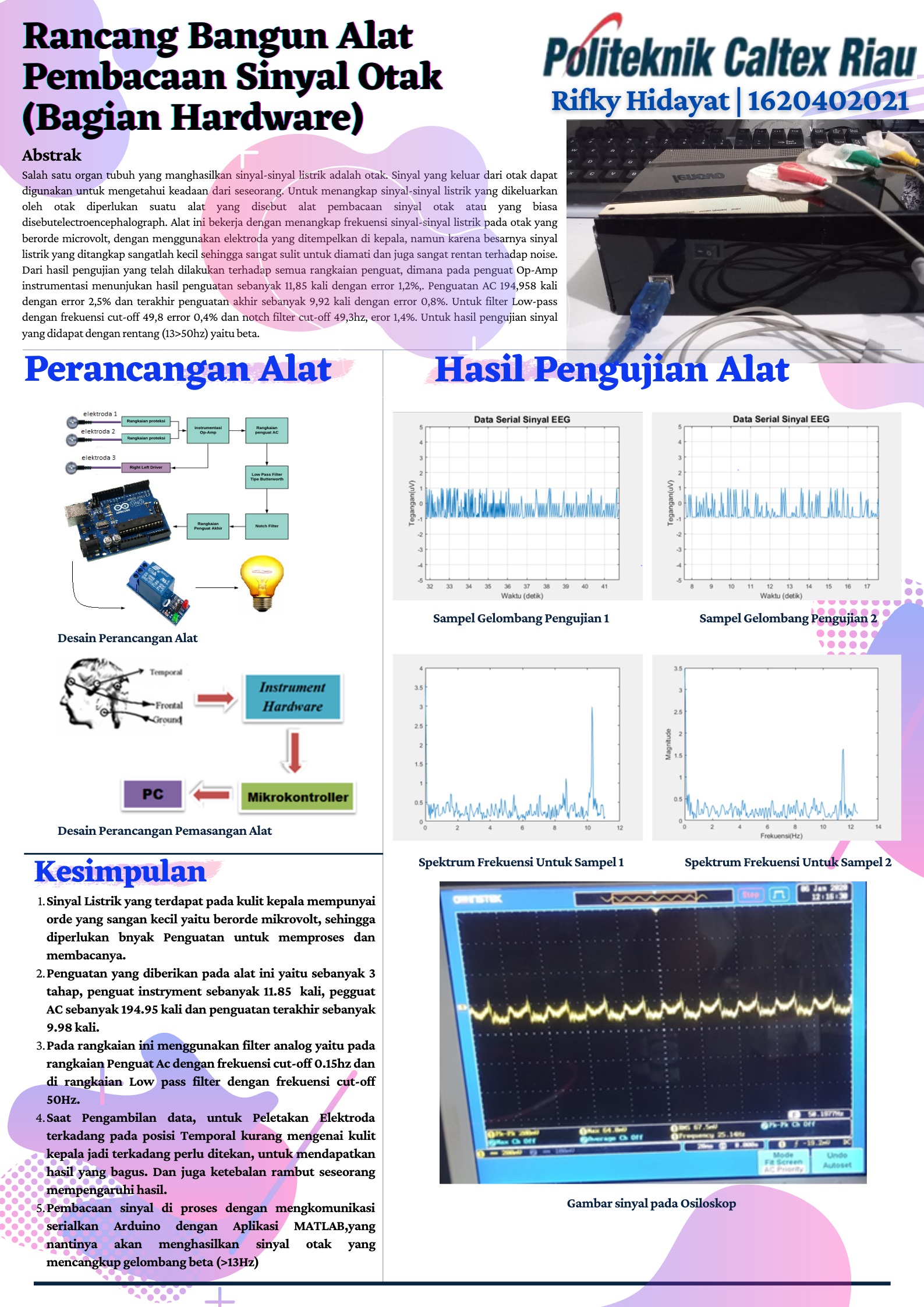 Salah satu organ tubuh yang manghasilkan sinyal-sinyal listrik adalah otak. Sinyal yang keluar dari otak dapat digunakan untuk mengetahui keadaan dari seseorang. Untuk menangkap sinyal-sinyal listrik yang dikeluarkan oleh otak diperlukan suatu alat yang disebut alat pembacaan sinyal otak atau yang biasa disebutelectroencephalograph. Alat ini bekerja dengan menangkap frekuensi sinyal-sinyal listrik pada otak yang berorde microvolt, dengan menggunakan elektroda yang ditempelkan di kepala, namun karena besarnya sinyal listrik yang ditangkap sangatlah kecil sehingga sangat sulit untuk diamati dan juga sangat rentan terhadap noise. Dari hasil pengujian yang telah dilakukan terhadap semua rangkaian penguat, dimana pada penguat Op-Amp instrumentasi menunjukan hasil penguatan sebanyak 11,85 kali dengan error 1,2%,. Penguatan AC 194,958 kali dengan error 2,5% dan terakhir penguatan akhir sebanyak 9,92 kali dengan error 0,8%. Untuk filter Low-pass dengan frekuensi cut-off 49,8 error 0,4% dan notch filter cut-off 49,3hz, eror 1,4%. Untuk hasil pengujian sinyal yang didapat dengan rentang (13>50hz) yaitu beta.