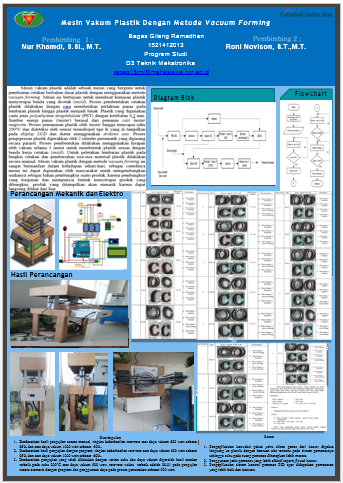 Mesin vakum plastik adalah sebuah mesin yang berguna untuk pembuatan cetakan berbahan dasar plastik dengan menggunakan metode vacuum forming. Mesin ini bertujuan untuk membuat kemasan plastik menyerupai benda yang dicetak (mold). Proses pembentukan cetakan plastik dilakukan dengan cara memberikan perlakuan panas pada lembaran plastik hingga plastik menjadi lunak. Plastik yang digunakan yaitu jenis polyethylene terephthalate (PET) dengan ketebalan 0,3 mm. Sumber energi panas (heater) berasal dari pemanas cast heater magicom. Proses pemanasan plastik oleh heater hingga mencapai suhu 200°C dan dideteksi oleh sensor termokopel tipe K yang di tampilkan pada display LCD dan diatur menggunakan Arduino uno. Proses