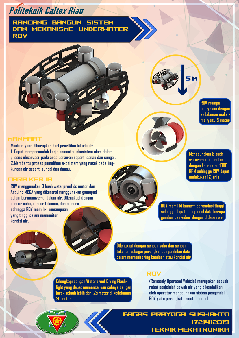 ROV (Remotely Operated Vehicle) merupakan sebuah robot penjelajah bawah air yang dikendalikan oleh operator menggunakan sistem pengendali ROV yaitu perangkat remote control. Indonesia sebagai Negara yang sebagian besar wilayahnya berupa perairan tentunya memerlukan proses monitoring bawah air demi terjaganya ekosistem dan sumber daya perairan. Banyak daerah perairan Indonesia memiliki berbagai macam resiko yang dapat membahayakan penyelam seperti hewan buas, limbah beracun, keterbatasan oksigen dan sebagainya. Karena permasalahan tersebut, maka dibuatlah projek akhir yaitu Rancang Bangun Sistem dan Mekanisme Underwater ROV (Remotely Operated Vehicle). Pada proyek akhir ini telah dibuat sebuah alat berupa robot kapal selam dengan menggunakan 8 motor dc untuk melakukan 12 jenis pergerakan di bawah air dengan hasilnya yaitu ROV dapat melakukan semua pergerakan tersebut kecuali salto kanan dan kiri. Dengan menggunakan driver motor BTS7960, setiap motornya dapat dikendalikan arah putar dan kecepatannya. Robot ini memiliki tujuan yaitu mengambil data berupa suhu, tekanan, dan gambar di dalam air dengan kedalaman maksimal yaitu 4 meter. Pengambilan data suhu dan tekanan dilakukan dengan menggunakan sensor suhu DS18B20 dan sensor tekanan BMP180 dan akan di tampilkan pada display LCD16x2. Hasil yang didapatkan yaitu sensor suhu memiliki error 0.34% dan sensor tekanan memiliki error 3,6%. Sedangkan pengambilan gambar atau video dilakukan menggunakan kamera CCTV yang disambungkan dengan laptop sebagai monitornyadengan hasil gambar yang di tangkap cukup jelas.