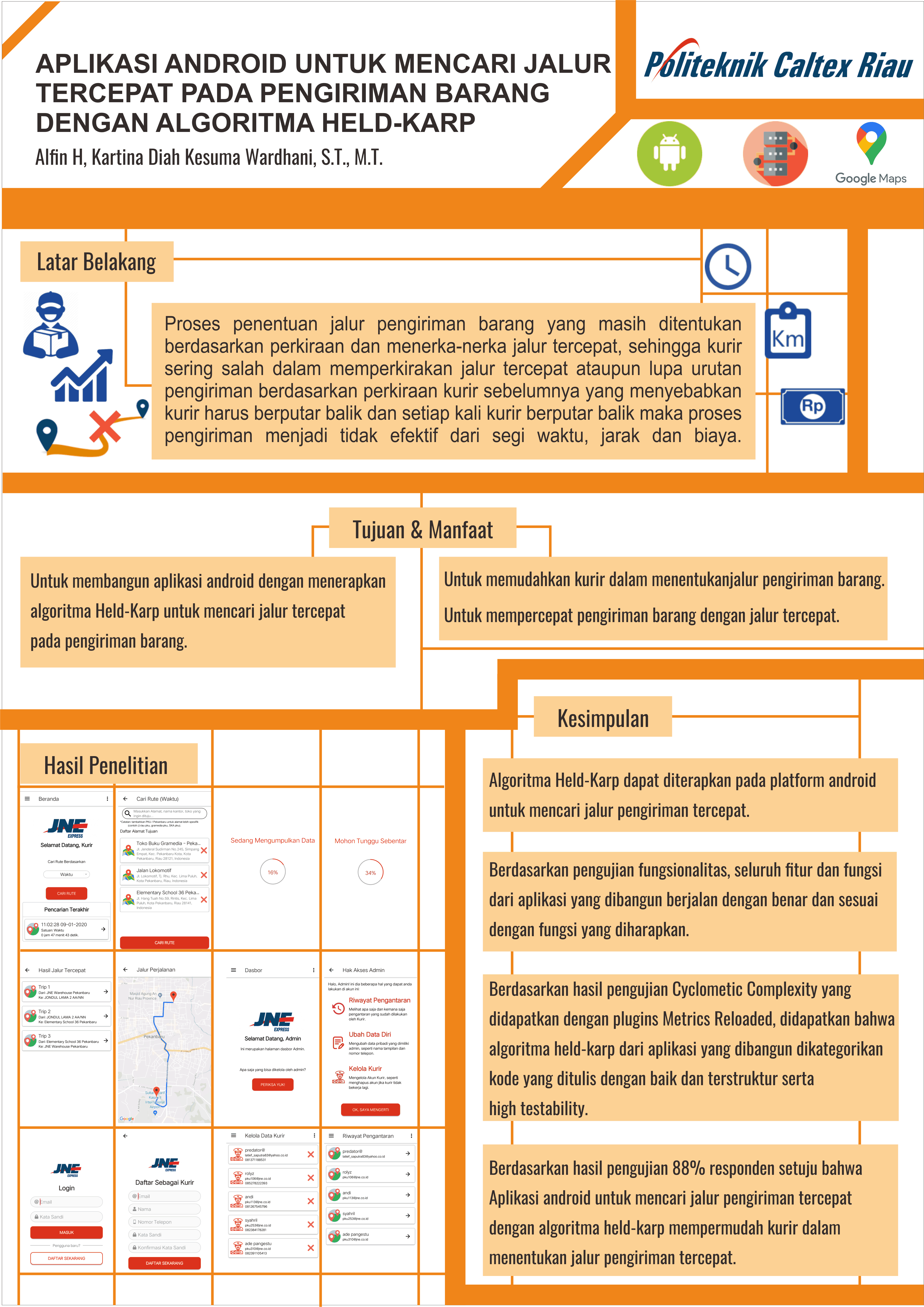 PT Tiki Jalur Nugraha Ekakurir (JNE) merupakan perusahaan yang bergerak dalam bidang pengiriman dan logistik. Seiring meningkatnya jumlah pengiriman barang, sedangkan proses kurir menentukan jalur pengiriman masih berdasarkan perkiraan, sehingga kurir kesulitan dalam menentukan jalur pengiriman tercepat yang efektif dari segi waktu, jarak dan biaya. Maka dari itu dibuat aplikasi berbasis android yang menggunakan Google Maps API untuk proses input alamat serta untuk mengetahui waktu, jarak dan biaya yang dibutuhkan pada setiap titik pengiriman, kemudian menerapkan algoritma Held-Karp untuk pencarian jalur tercepat berdasarkan waktu, jarak dan biaya. Pada aplikasi terdapat halaman admin yang dapat memantau jalur pengiriman yang pernah dilakukan oleh kurir-kurir. Berdasarkan pengujian fungsionalitas diketahui bahwa aplikasi telah berjalan dengan benar dan sesuai dengan fungsi yang diharapkan, kemudian pada pengujian cyclometic complexity, algoritma held-karp dikategorikan dalam kode yang ditulis dengan baik dan terstruktur serta high testability karena tidak terdapat v(G) diatas 10, Sementara berdasarkan hasil pengujian kekesuaian sistem, didapatkan 88% setuju aplikasi yang dibangun mudah dipelajari, kemudian 80% responden setuju bahwa informasi yang diberikan oleh aplikasi mudah untuk dipahami dan 88% responden setuju bahwa aplikasi dapat memudahkan proses menentukan jalur pengiriman tercepat.