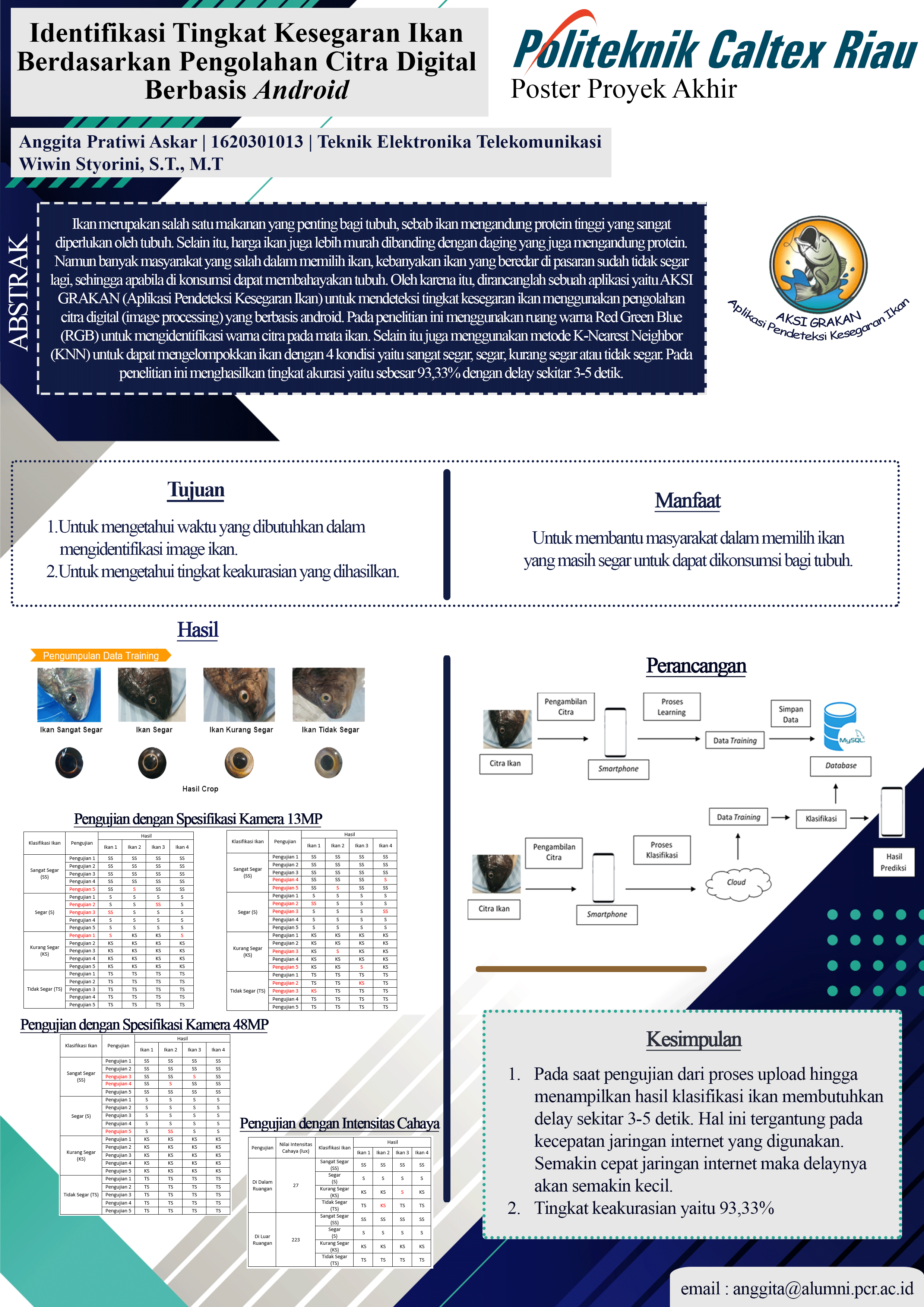 Ikan merupakan salah satu makanan yang penting bagi tubuh, sebab ikan mengandung protein tinggi yang sangat diperlukan oleh tubuh. Selain itu, harga ikan juga lebih murah dibanding dengan daging yang juga mengandung protein. Namun banyak masyarakat yang salah dalam memilih ikan, kebanyakan ikan yang beredar di pasaran sudah tidak segar lagi, sehingga apabila di konsumsi dapat membahayakan tubuh. Oleh karena itu, dirancanglah sebuah aplikasi yaitu AKSI GRAKAN (Aplikasi Pendeteksi Kesegaran Ikan) untuk mendeteksi tingkat kesegaran ikan menggunakan pengolahan citra digital (image processing) yang berbasis android. Pada penelitian ini menggunakan ruang warna Red Green Blue (RGB) untuk mengidentifikasi warna citra pada mata ikan. Selain itu juga menggunakan metode K-Nearest Neighbor (KNN) untuk dapat mengelompokkan ikan dengan 4 kondisi yaitu sangat segar, segar, kurang segar atau tidak segar. Pada penelitian ini menghasilkan tingkat akurasi yaitu sebesar 93,33% dengan delay sekitar 3-5 detik.