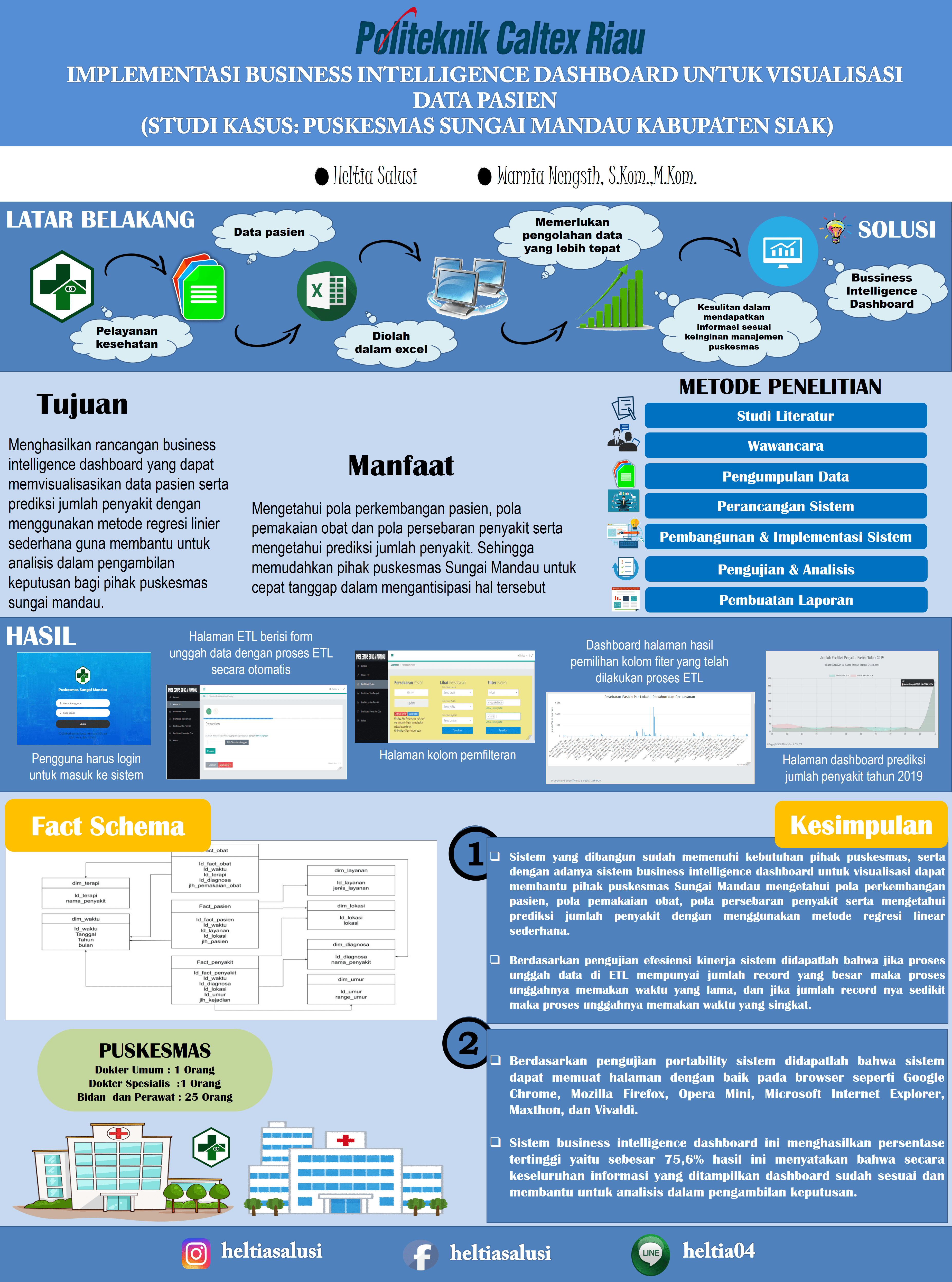 Pusat Kesehatan Masyarakat (Puskesmas) adalah organisasi fungsional yang menyelenggarakan upaya kesehatan yang bersifat menyeluruh, terpadu, dapat diterima dan terjangkau oleh masyarakat. Salah satu pusat kesehatan adalah puskesmas Sungai Mandau. Puskesmas ini mempunyai data pasien yang masih diolah dalam bentuk Microsoft Excel. Namun, pihak puskesmas masih sulit dalam menganalisis data pasien untuk pengambilan keputusan. Terutama kesulitan dalam menganalisa pola sebaran pasien, pola penyakit, pola penggunaan obat dan prediksi jumlah penyakit. Business Intelligence (BI) adalah solusi untuk menganalisis serta menyuguhkan akses data untuk memudahkan dalam pengambilan keputusan dalam masalah tersebut, serta metode Regresi Linier sederhana yang berguna untuk melihat bentuk hubungan variabel bebas dan terikat guna mengetahui prediksi jumlah penyakit. Dari hasil pengujian dan analisa didapatlah bawah 75,6% sistem implementasi business intelligence dashboard untuk visualisasi data pasien membantu pihak puskesmas untuk analisis dalam pengambilan keputusan.