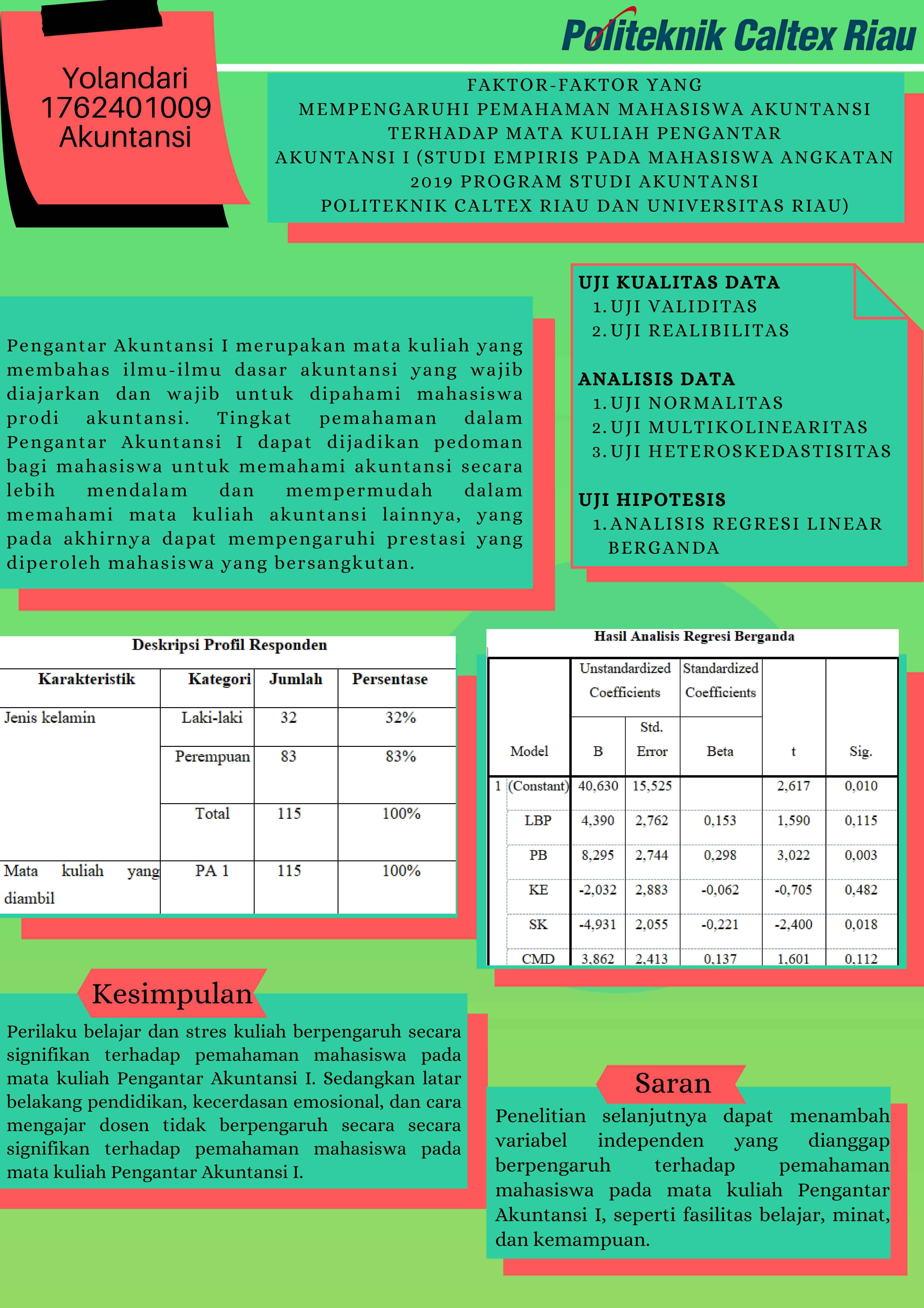 Faktor-Faktor Yang Mempengaruhi Pemahaman Mahasiswa Akuntansi Terhadap Mata Kuliah Pengantar Akuntansi I (Studi Empiris Pada Mahasiswa Angkatan 2019 Program Studi Akuntansi Politeknik Caltex Riau Dan Universitas Riau)
