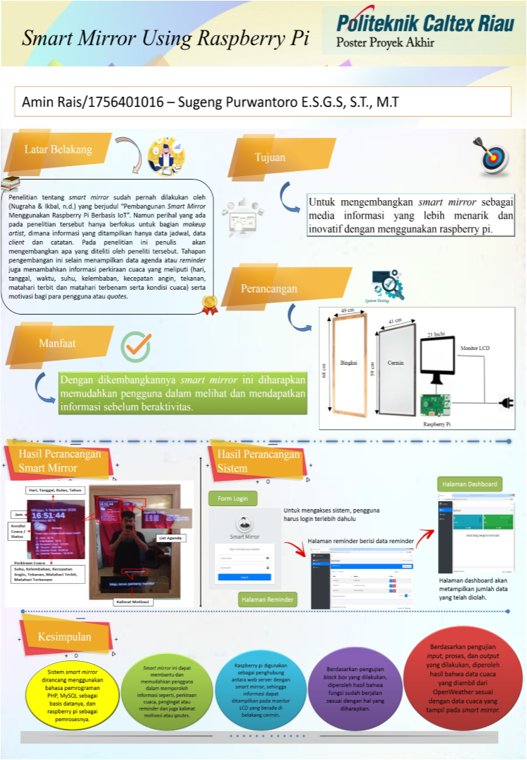 Dalam kemajuan teknologi yang pesat, orang-orang diharapkan lebih produktif dan efisien dalam kegiatan sehari-hari mereka. Bagi pengguna ponsel pintar, laptop, dan perangkat serupa lainnya juga telah disediakan fitur untuk mengefisienkan waktu. Pada umumnya, cermin adalah salah satu benda yang dapat memantulkan cahaya. Seiring berkembangnya waktu, saat ini cermin dapat di fungsikan sebagai alat untuk menampilkan informasi dengan cara mengubah cermin tersebut menjadi sebuah smart mirror. Smart mirror merupakan sistem yang telah diprogram dan dapat bekerja dengan bantuan raspberry pi untuk menampilkan berbagai informasi. Penelitian tentang smart mirror sudah pernah dilakukan oleh Nugraha yang berjudul “Pembangunan Smart Mirror Menggunakan Raspberry Pi Berbasis IoTâ€. Namun perihal yang ada pada penelitian tersebut hanya berfokus untuk bagian makeup artist, dimana informasi yang ditampilkan hanya data jadwal, data client dan catatan. Oleh karena itu, penulis mengembangkan penelitian tersebut agar dapat membantu semua kalangan dalam memperoleh informasi, bukan hanya pada makeup artist saja. Smart mirror diuji dengan menggunakan pengujian black box testing dan pengujian input, proses dan output. Berdasarkan pengujian black box yang dilakukan, diperoleh hasil bahwa fungsionalitas sistem 100% sudah berjalan sesuai dengan yang diharapkan. Dengan adanya smart mirror ini dapat membantu pengguna dalam mendapatkan informasi mengenai perkiraan cuaca, dan juga sebagai pengingat agenda yang akan dilaksanakan.