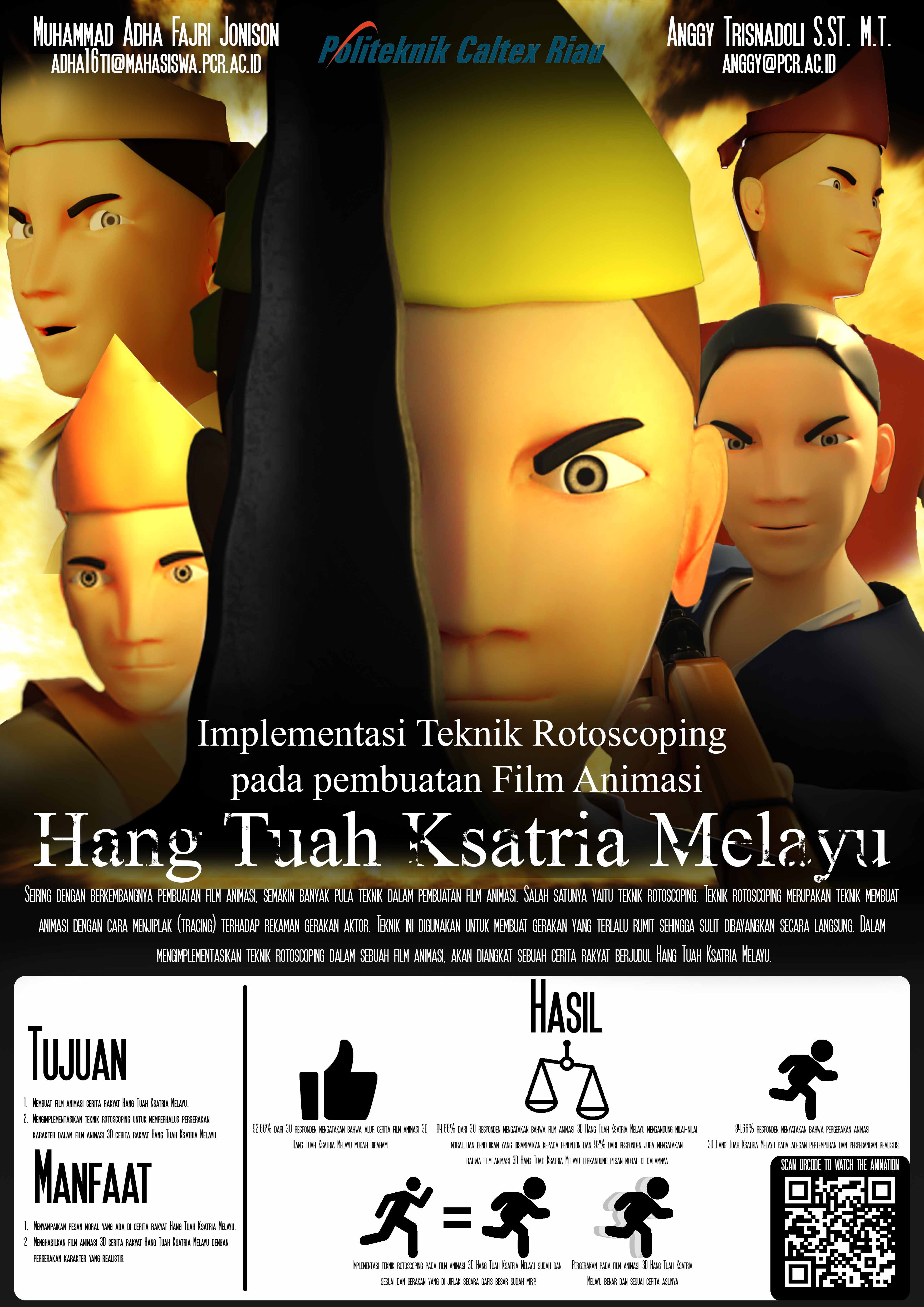 Perkembangan teknologi informasi pada bidang multimedia berkembang sangat pesat dewasa ini. Perkembangan multimedia yang kerap ditemukan yaitu pada pembuatan film animasi. Seiring dengan berkembangnya pembuatan film animasi, semakin banyak pula teknik dalam pembuatan film animasi. Salah satunya yaitu teknik rotoscoping. Teknik rotoscoping merupakan teknik membuat animasi dengan cara menjiplak (tracing) terhadap rekaman gerakan aktor. Teknik ini digunakan untuk membuat gerakan yang terlalu rumit sehingga sulit dibayangkan secara langsung. Dalam mengimplementasikan teknik rotoscoping dalam sebuah film animasi, akan diangkat sebuah cerita rakyat berjudul Hang Tuah Ksatria Melayu. Cerita rakyat ini akan dikemas menjadi sebuah film animasi 3D dengan menggunakan teknik rotoscoping. Dengan dibuatnya film animasi 3D cerita rakyat Hang Tuah Ksatria Melayu, dapat tercipta sebuah film animasi dengan hasil pergerakan karakter yang realistis. Selain itu, film animasi 3D ini dapat mendukung digital pariwisata daerah Melayu Riau daratan dan kepulauan, dan masyarakat pun mendapatkan pesan moral dari cerita rakyat Hang Tuah Ksatria Melayu.