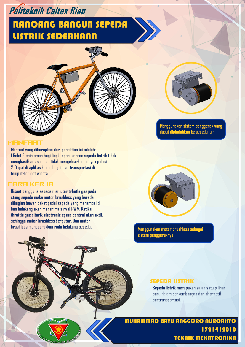 Seiring dengan perkembangan zaman, teknologi di bidang transportasi terus berkembang pesat. Hal ini ditandai dengan bermunculannya kendaraan yang modern dan praktis untuk digunakan. Salah satu contohnya adalah sepeda listrik. sepeda listrik merupakan salah satu pilihan baru dalam perkembangan dan alternatif bertransportasi. Karena permasalahan tersebut dibuatlah sebuah alat bantu yang dapat mengubah sepeda biasa menjadi sepeda listrik. Sehingga pemilik sepeda dengan sederhana dan mudah mengubah sepeda biasa menjadi sepeda listrik. Alat ini menggunakan baterai sebagai sumber energinya dan memiliki pengatur kecepatan yang diletakan pada stang sepeda. Yang berfungsi sebagai pengatur PWM melalui pulse generator. Disaat pengguna sepeda memutar trhotle gas pada stang sepeda maka motor brushless yang berada dibagian bawah dekat pedal sepeda yang menempel di ban belakang akan menerima sinyal PWM. Ketika throttle gas ditarik electronic speed control akan aktif, sehingga motor brushless berputar. Dan motor brushless menggerakkan roda belakang sepeda. Sepeda listrik sederhana ini memiliki kecepatan maksimum 27.1 Km/jam dengan berat pengendara maksimum 100 kg.