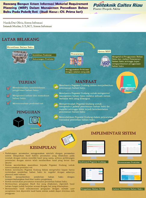 CV. Prima Sari merupakan salah satu pabrik penghasil roti yang berdiri sejak tahun 2003. CV. Prima Sari melakukan produksi setiap hari dimana jumlah produksi roti mencapai hingga ribuan roti. Namun, dengan jumlah produksi roti yang relatif tinggi tersebut perhitungan penggunaan bahan baku untuk produksi masih belum dilakukan secara optimal. Hal tersebut mengakibatkan pabrik roti sering kali mengalami masalah yaitu kelebihan jumlah produksi roti yang menyebabkan roti menjadi terbuang. Di sisi lain, pemesanan bahan baku selama ini hanya dilakukan berdasarkan pengalaman dan catatan arus penggunaan bahan sehingga tidak terjadwal dengan baik. Oleh karena itu, solusi untuk mengatasi masalah tersebut dengan cara menerapkan sistem informasi MRP dengan menggunakan metode peramalan SES untuk penentuan jumlah produksi dan teknik lot sizing FOQ dalam menentukan jumlah pembelian bahan baku. Output dari Sistem informasi ini memberikan informasi mengenai planned order release kepada Pegawai Gudang. Berdasarkan hasil pengujian yang dilakukan terhadap sistem yang dibangun menggunakan black box, didapatkan hasil bahwa sistem sudah 100% berhasil dibangun sesuai yang diharapkan. Pengujian dengan metode UAT, menunjukkan sistem telah diterima dengan baik oleh pengguna.