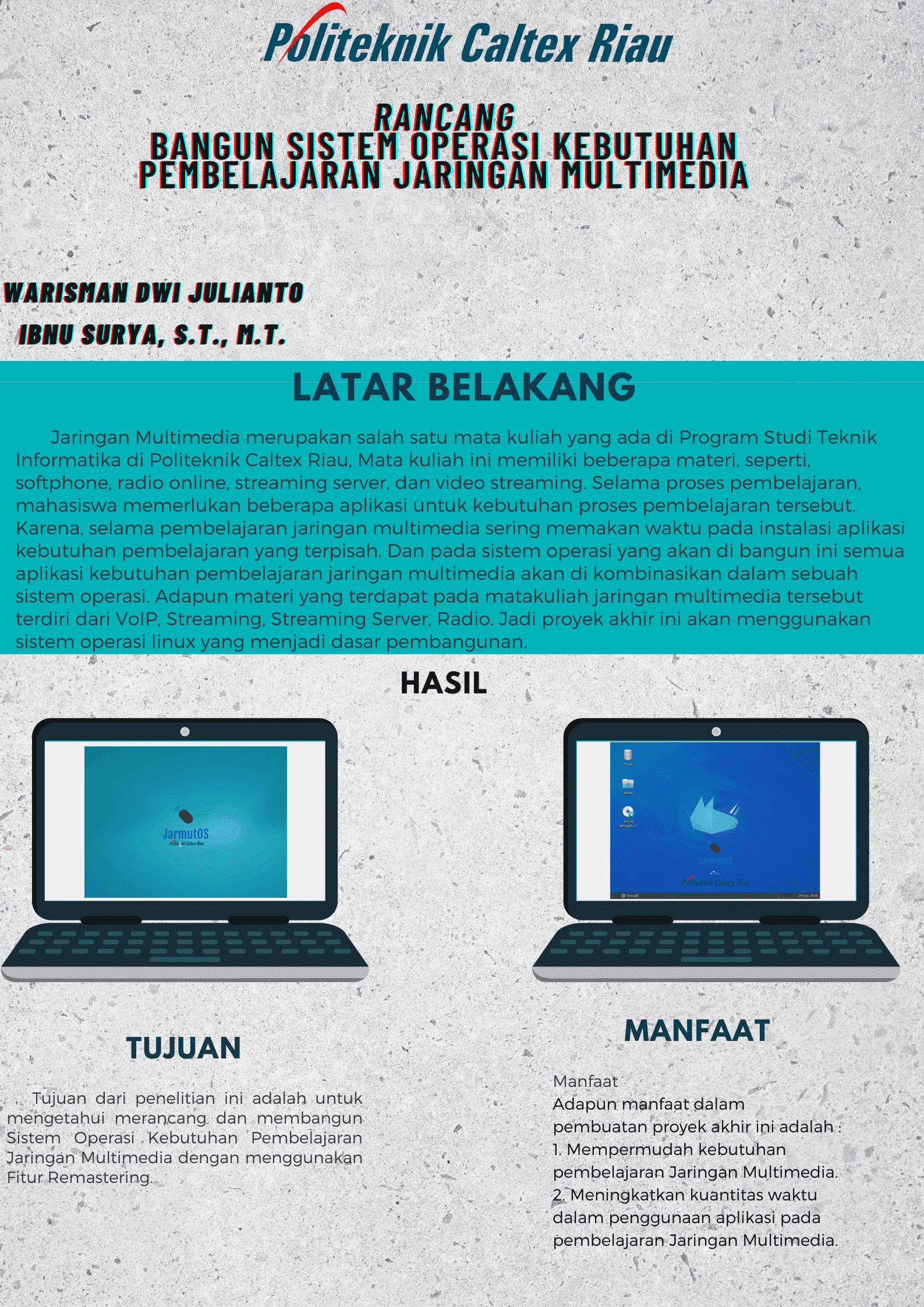 Sistem Operasi adalah menghubungkan antara perangkat keras dan perangkat lunak. Sekarang ini Sistem Operasi sudah memiliki fitur multithreading, yang memungkinkan untuk menjalankan berbagai program secara bersamaan. Dalam bidang software remastering merupakan sebagai sebuah proses pembungkusan ulang paket aplikasi pada sistem operasi dimana bisa menambah bahkan bisa juga mengurangi paket aplikasi yang disertakan. Bisa diartikan bahwa remastering merupakan proses pembuatan sistem operasi baru dengan paket aplikasi yang berbeda dari sistem aslinya (default). Dengan remastering kita bisa untuk menambah atau mengurangi paket aplikasi di sistem operasi yang sudah tersedia dengan paket aplikasi yang baru. Jaringan Multimedia merupakan salah satu mata kuliah yang ada di Program Studi Teknik Informatika di Politeknik Caltex Riau, Mata kuliah ini memiliki beberapa materi, seperti, voip, radio online, streaming server, dan video streaming. Karena, selama pembelajaran jaringan multimedia sering memakan waktu pada instalasi aplikasi kebutuhan pembelajaran yang terpisah. Dan pada sistem operasi yang akan di bangun ini semua aplikasi kebutuhan pembelajaran jaringan multimedia akan di kombinasikan dalam sebuah sistem operasi. Adapun materi yang terdapat pada matakuliah jaringan multimedia tersebut terdiri dari VoIP, Streaming, Radio. Jadi proyek akhir ini akan menggunakan sistem operasi linux yang menjadi dasar pembangunan. Berdasarkan hasil dari jumlah pilihan pengujian User Acceptence Testing (UAT) yang telah di lakukan kepada Dosen pengajar matakuliah Jaringan Multimedia dan Mahasiswa yang pernah belajar matakuliah Jaringan Multimedia di dapati analisis bahwa Sistem Operasi ini pantas untuk di gunakan untuk membantu pembelajaran matakuliah Jaringan Multimedia.