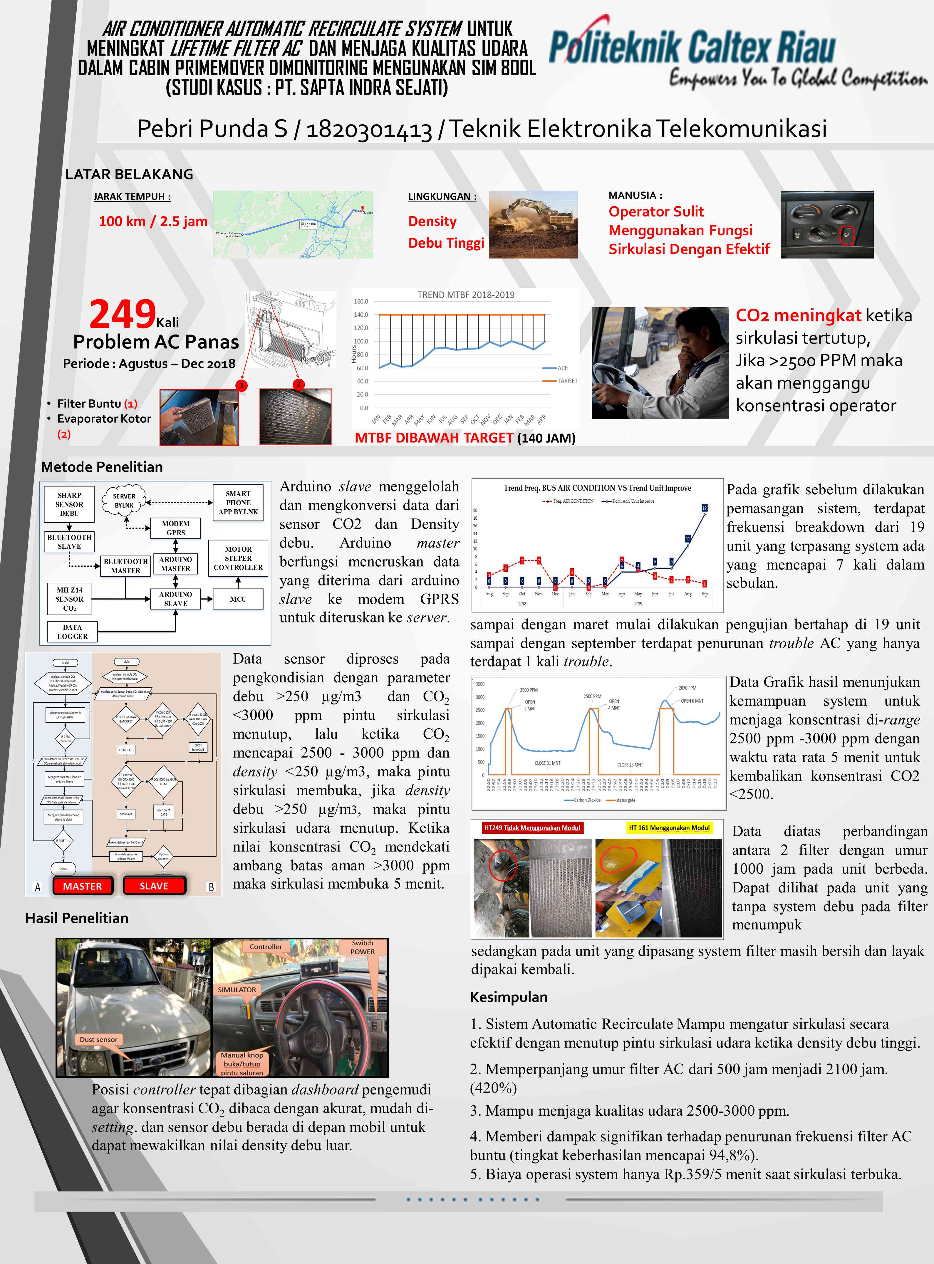 Dalam proses pertambangan batu-bara dibutuhkan alat transportasi dengan ketahanan operasi minimal 80 jam (MTBF,2018), namun aktualnya tidak tercapai, salah satunya diakibatkan filter AC buntu. Faktor lingkungan berdebu dan operator tidak konsisten mengoperasikan sistem resirkulasi udara dengan efektif menjadi penyebab utamanya, hal ini menjadi latar belakang diajukannya tugas akhir yang berjudul “Air Conditioner Automatic Recirculate System untuk Meningkat Lifetime Filter AC Primemover†metodenya dengan mengatur sirkulasi udara berdasarkan parameter dari sensor debu di luar kabin dan konsentrasi CO2 di dalam kabin. Saat density debu diatas 250µg/m3 dan kandungan CO2 dibawah 3000 ppm pintu sirkulasi menutup. Pintu sirkulasi membuka ketika CO2 diatas 3000 ppm atau CO2 diatas 2500 ppm dan density debu dibawah 250 µg/m3. Setiap perubahan kondisi tersimpan pada sdcard, dimonitoring dan dikontrol melalui jaringan GPRS menggunakan aplikasi BLYNK. Keberhasilan 420% mampu memperpanjang lifetime filter menjadi 2100 jam yang dari sebelumnya 140-500 jam dan kondisi udara dalam kabin terjaga dibatas aman 2500 ke
