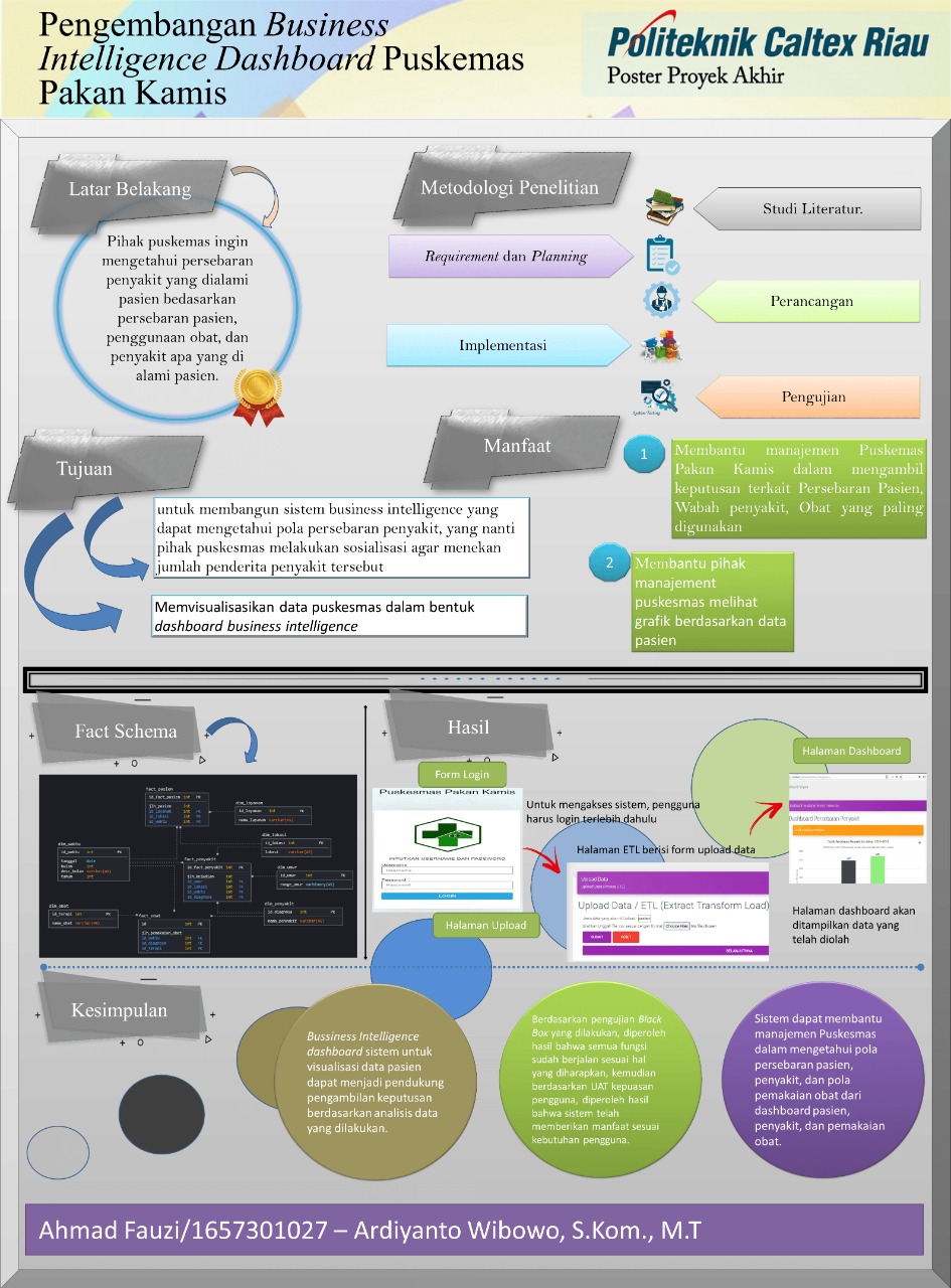 Pusat Kesehatan Masyarakat (Puskemas) merupakan layanan kesehatan yang di naungi oleh dinas kesehatan. Puskesmas juga merupakan pilihan pertama masyarakat Indonesia kalangan menengah, baik menengah keatas , maupun menengah kebawah. Hal itu dikarenakan biaya layanan puskesmas tidak setinggi biaya layanan di rumah sakit. Salah satu unit layanan yang melakukan aktivitas pelayanan kesehatan adalah Puskesmas Pakan Kamis. Pelayanan kesehatan puskesmas Pakan Kamis ditujukan pada suatu subyek yang disebut pasien. Data pasien ini perlu pengelolaan secara tepat sehingga menghasilkan informasi yang dapat digunakan sebagai bukti pelayanan puskesmas, sumber pelaporan, serta sebagai pendukung dalam pengambilan keputusan. Puskesmas Pakan Kamis sudah mengelola data pasien menggunakan Microsoft Excel berbentuk spreedsheet. Akan tetapi, Puskesmas Pakan Kamis kesulitan dalam mengetahui pola persebaran penyakit, pola perkembangan pasien, dan pola pemakaian obat. Salah satu upaya untuk menghadapi ini adalah dengan menggunakan business intelligence berbasis web yang juga menggunakan database sebagai pecatatan data-data pasien dan juga dengan penerapan metode four step Kimball akan menunjang poin-poin penting yang berguna bagi pihak puskesmas. Dashboard yang dirancang menggunakan bahasa pemrograman PHP dan MySQL sebagai DBMS nya. Hasil dari pengujian Black Box yang dilakukan menunjukkan bahwa semua fitur pada sistem telah diimplementasikan dan sesuai dengan hasil yang diharapkan. Dengan adanya business intelligence ini diharapkan pihak management dapat terbantu dalam menangani masalah-masalah terkait pencatantan laporan, penyimpanan data pasien dan pengambilan keputusan dalam memesan obat saat musim penyebaran penyakit datang.