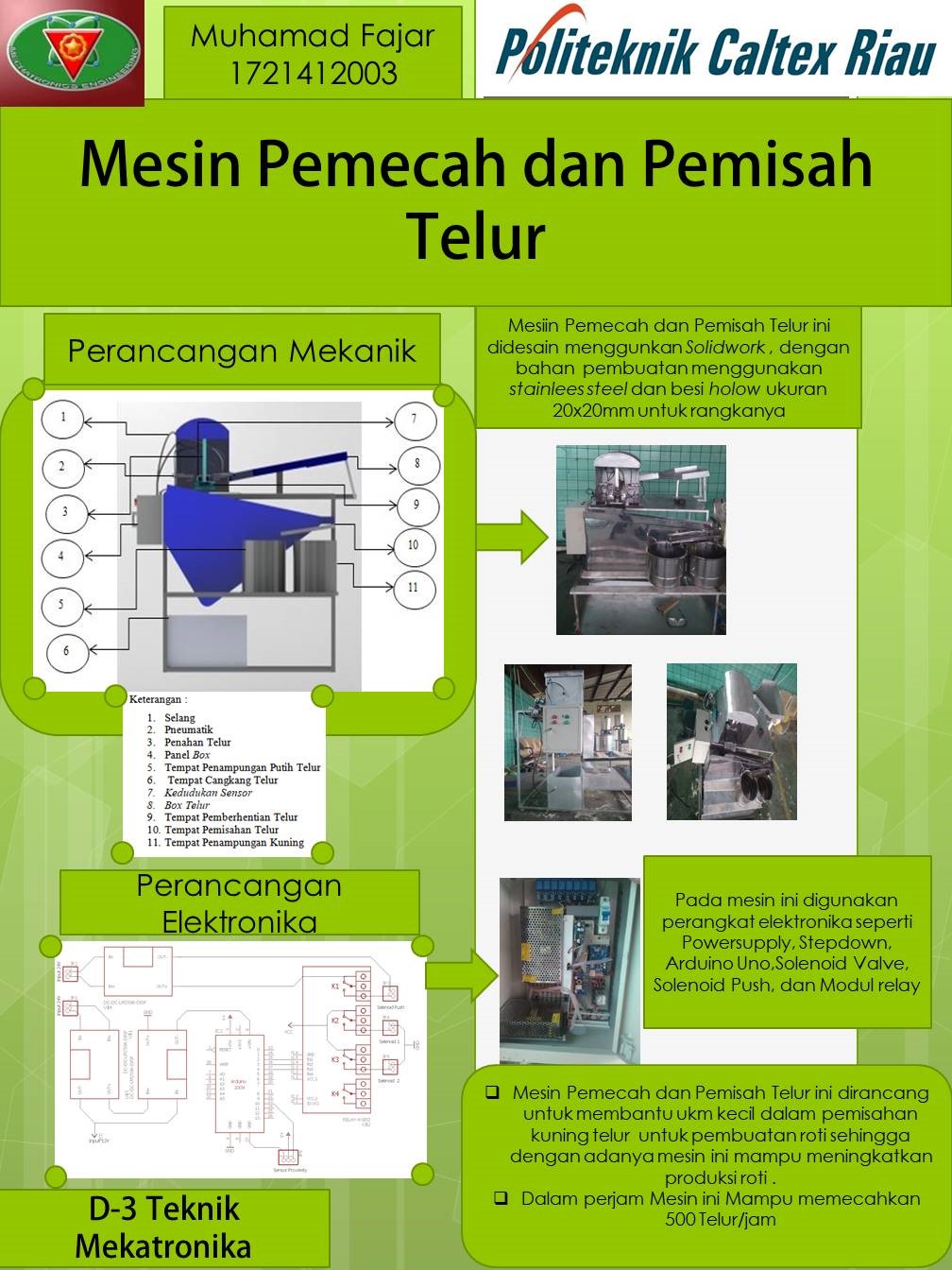 Telur adalah salah satu hasil bahan pokok yang berasal dari sektor peternakan yang menjadi salah satu komoditas unggulan dalam produk ekspor Indonesia selain menjadi komoditas produk ekspor telur juga salah satu bahan pokok yang banyak dimanfaatkan dalam pembuatan berbagai macam produk makanan contohnya, jajanan pasar dan kue bolu yang banyak dijual di berbagai macam toko atau pasar, tetapi dalam pembuatan roti kebanyakan hanya menggunakan kuning telur yang mana biasanya pemisahan kuning telur dilakukan secara manual sehingga memerlukan waktu yang cukup lama. Mesin ini menggunakan Arduino uno sebagai mikrokontrollernya dengan sistem pneumatik sebagai penggerak maju mundur dari pencekam yang menggunakan vacuum pad dan pada pemukulnya menggunakan solenoid push. Mesin ini mampu memecahkan telur dari ukuran 5,4 cm sampai 6,5 cm dengan waktu yang dibutuhkan dalam 1x proses sebesar 7,2 detik sehingga dalam 1 jam mesin ini mampu memecahkan telur sebesar 500 telur/jam. Persentase keberhasilan posisi dan pencekaman 92%, pemecahan 71%, dan pemisahannya 68%.