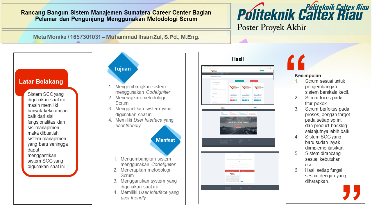 Perguruan tinggi saat ini berlomba-lomba untuk membangun sistem informasi career center untuk mempermudah alumninya dalam mencari pekerjaan. Dengan semakin banyaknya lulusan dari Politeknik Caltex Riau dan meningkatnya jalinan hubungan kerjasama dengan perusahaan atau penyedia lowongan pekerjaan maka diperlukanlah sebuah sistem yang dapat mempermudah dalam mengelola informasi lowongan kerja. Politeknik Caltex Riau memiliki sebuah sistem dengan nama Sumatera Career Center (SCC) yang bertujuan untuk menjadi pusat informasi lowongan pekerjaan yang mempermudah alumninya dalam mencari pekerjaan maupun perusahaan dalam mencari pekerja. Pihak SCC ingin memperbarui website karena adanya berbagai masalah pada website yang digunakan pada saat ini. Oleh karena itu, dibuatlah sebuah SCC yang baru dengan menggunakan framework CodeIgniter dan MySQL sebagai database server serta dikembangkan dengan menggunakan metodologi scrum. Hasil yang diperoleh yaitu sistem yang memiliki tampilan yang user friedly, mudah untuk digunakan dan layak menggantikan sistem SCC yang sebelumnya. Berdasarkan hasil pengujian black box diperoleh hasil bahwa setiap fungsi-fungsi yang berada pada setiap halaman sesuai dengan hasil yang diharapkan dan berdasarkan pengujian usability bahwa sistem telah dirancang sesuai dengan kebutuhan user.