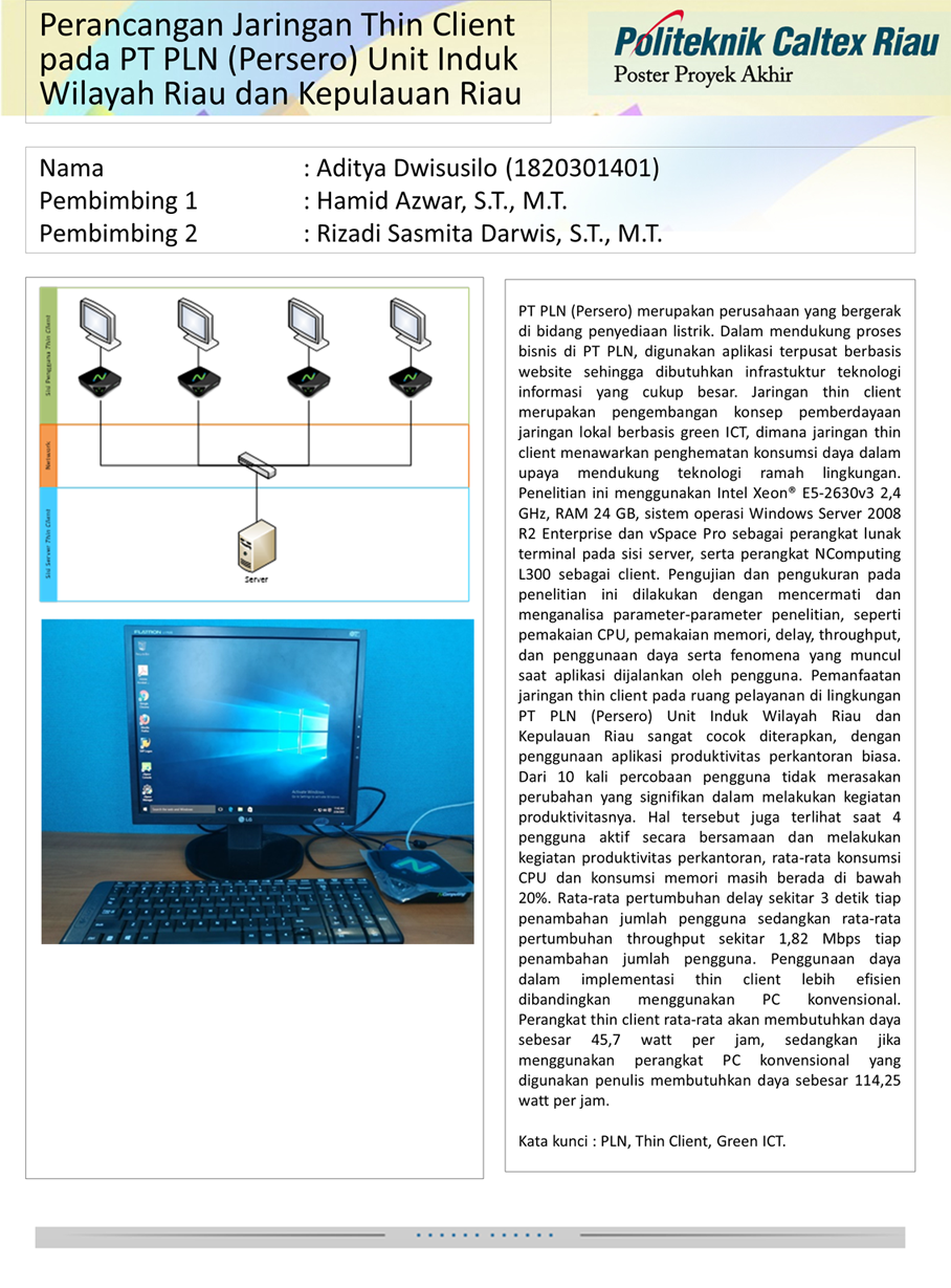 PT PLN (Persero) merupakan perusahaan yang bergerak di bidang penyediaan listrik. Dalam mendukung proses bisnis di PT PLN, digunakan aplikasi terpusat berbasis website sehingga dibutuhkan infrastuktur teknologi informasi yang cukup besar. Jaringan thin client merupakan pengembangan konsep pemberdayaan jaringan lokal berbasis green ICT, dimana jaringan thin client menawarkan penghematan konsumsi daya dalam upaya mendukung teknologi ramah lingkungan. Penelitian ini menggunakan Intel Xeon® E5-2630v3 2,4 GHz, RAM 24 GB, sistem operasi Windows Server 2008 R2 Enterprise dan vSpace Pro sebagai perangkat lunak terminal pada sisi server, serta perangkat NComputing L300 sebagai client. Pengujian dan pengukuran pada penelitian ini dilakukan dengan mencermati dan menganalisa parameter-parameter penelitian, seperti pemakaian CPU, pemakaian memori, delay, throughput, dan penggunaan daya serta fenomena yang muncul saat aplikasi dijalankan oleh pengguna. Pemanfaatan jaringan thin client pada ruang pelayanan di lingkungan PT PLN (Persero) Unit Induk Wilayah Riau dan Kepulauan Riau sangat cocok diterapkan, dengan penggunaan aplikasi produktivitas perkantoran biasa. Dari 10 kali percobaan pengguna tidak merasakan perubahan yang signifikan dalam melakukan kegiatan produktivitasnya. Hal tersebut juga terlihat saat 4 pengguna aktif secara bersamaan dan melakukan kegiatan produktivitas perkantoran, rata-rata konsumsi CPU dan konsumsi memori masih berada di bawah 20%. Rata-rata pertumbuhan delay sekitar 3 detik tiap penambahan jumlah pengguna sedangkan rata-rata pertumbuhan throughput sekitar 1,82 Mbps tiap penambahan jumlah pengguna. Penggunaan daya dalam implementasi thin client lebih efisien dibandingkan menggunakan PC konvensional. Perangkat thin client rata-rata akan membutuhkan daya sebesar 45,7 watt per jam, sedangkan jika menggunakan perangkat PC konvensional yang digunakan penulis membutuhkan daya sebesar 114,25 watt per jam.