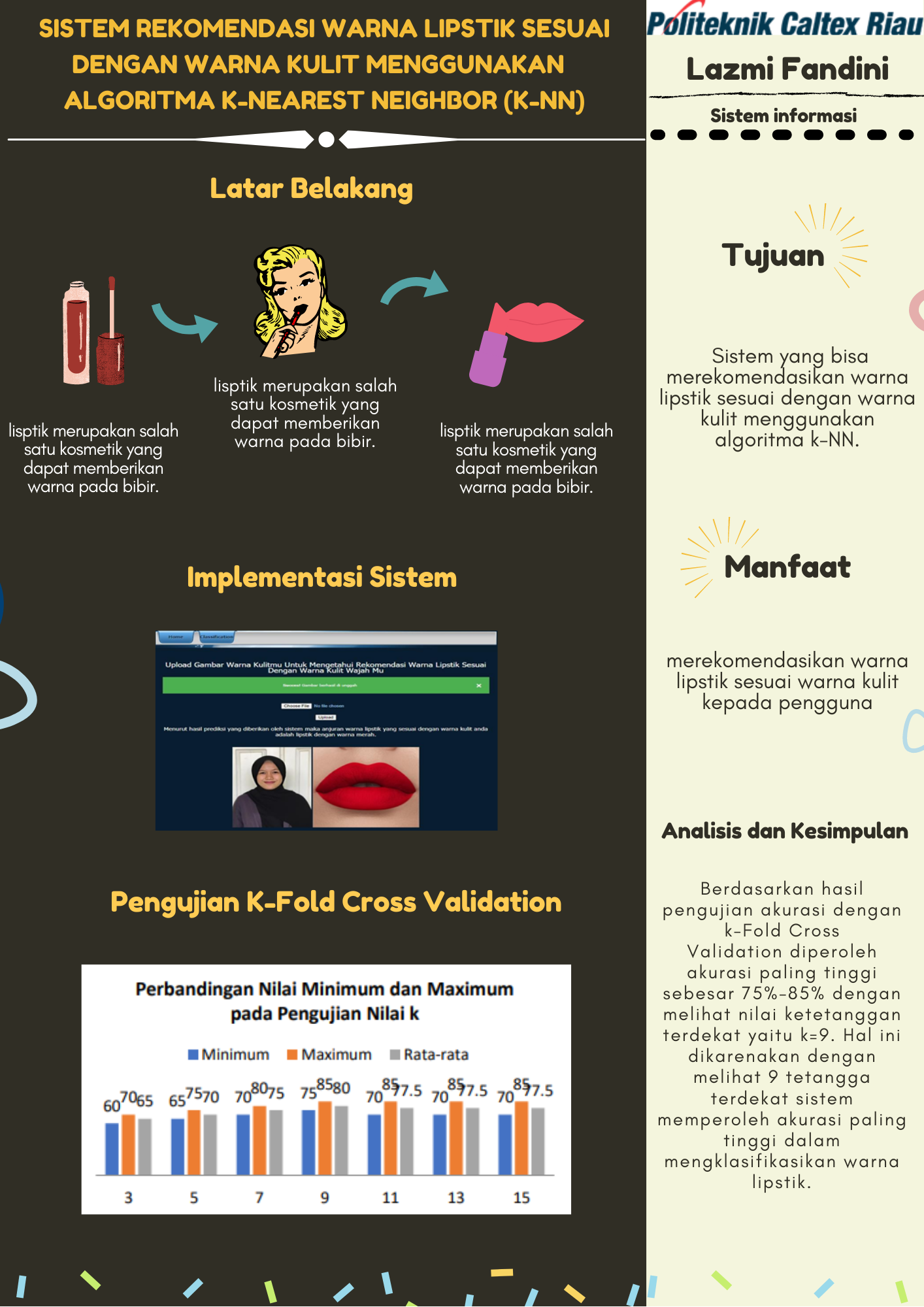 Lipstik merupakan salah satu kosmetik yang sangat diminati oleh wanita,kebanyakan wanita tidak pernah merasa cukup dengan memiliki satu lipstik, bahkan memiliki beberapa lipstik dengan shade atau warna yang sama. Hal ini dikarenakan saat pergi ke toko kosmetik atau saat ingin membeli lipstik banyak wanita yang kebingungan memilih warna lipstik yang ingin dibeli, karena mempertimbangkan cocok atau tidak dengan warna kulit saat diaplikasikan pada bibir. Berdasarkan hasil wawancara dengan Dr. Rifka Shafiyah (Natasha Skin Clinic Center Pekanbaru) warna kulit wajah bisa digunakan untuk mengetahui warna lipstik yang cocok saat digunakan. Berdasarkan masalah diatas, dibuatlah sistem untuk mengklasifikasikan kecocokan warna lipstik sesuai dengan warna kulit wajah dengan menggunakan algoritma k-nearest neighbor,dimana pada sistem ini merekomendasikan lima warna lipstik yang dominan digunakan sehari-hari diantaranya merah,pink,nude,coral dan wine. Berdasarkan pengujian yang telah dilakukan dengan menggunakan 100 data training dengan nilai k dari 3-15 sistem ini memiliki tingkat akurasi tertinggi mencapai 75%-85% dengan nilai K=9. Pengujian usability test, hasil pengujian menunjukkan rata-rata 91,9% bahwa pengguna sangat terbantu dengan adanya sistem ini.Pengujian dengan blackbox didapatkan bahwa 100% fungsionalitas sistem berjalan dengan baik. Dan pengujian yang terakhir adalah pengujian whitebox, berdasarkan hasil uji coba jalur independen pada kode program tersebut telah sesuai. Sehingga dapat disimpulkan bahwa kode program telah berjalan dengan baik.