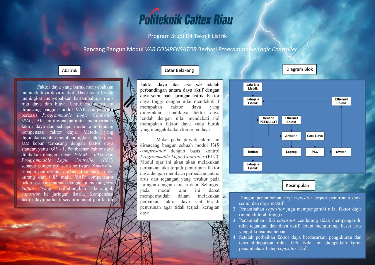 Faktor daya yang buruk menyebabkan meningkatnya daya reaktif. Daya reaktif yang meningkat menyebabkan bertambahnya rugi-rugi daya dan biaya. Untuk mengatasi ini dirancang bangun modul VAR compensator berbasis Programmable Logic Controller (PLC). Alat ini digunakan untuk memperbaiki faktor daya dan sebagai modul ajar tentang kompensasi faktor daya. Metode yang digunakan adalah membandingkan faktor daya saat beban terpasang dengan faktor daya standar, yaitu 0,85 - 1. Pembacaan faktor daya dilakukan dengan sensor PZEM – 004T dan Programmable Logic Controller (PLC) sebagai pengontrol serta software Somachine sebagai pemrogram Ladder. Jika faktor daya kurang dari 0,85 maka VAR compensator bekerja secara manual dengan menekan push button yang terhubungkan kelompok capasitor ke jaringan listrik. Kompensasi faktor daya berhenti secara manual jika faktor daya mendekati 1. Dengan penambahan capasitor, faktor daya dapat diperbaiki sehingga daya reaktif dan arus yang dikonsumsi beban berkurang.