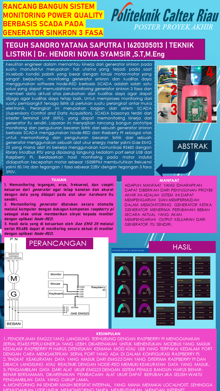 monitoring generator sinkron dan kualitas daya menggunakan software Node-RED berbasis SCADA adalah salah satu solusi yang dapat memudahkan monitoring generator sinkron 3 fasa dan memberi data aktual atas perubahan dari kualitas daya agar dapat dijaga agar kualitas daya tetap baik. Untuk memproses monitoring dari suatu pembangkit tenaga listrik di perlukan suatu perangkat antar muka elektronik. Perangkat ini merupakan bagian dari sistem SCADA (Supervisory Control and Data Acquisition). SCADA biasanya terdiri dari Master Terminal Unit (MTU), yang dapat memonitoring kinerja dari generator itu sendiri. Laporan ini menyajikan rancang bangun prototipe monitoring dan pengukuran besaran listrik dari sebuah generator sinkron berbasis SCADA menggunakan Node-RED dan Rasberry Pi sebagai otak untuk memonitoring dan pengukuran besaran listrik dari sebuah generator menggunakan sebuah alat ukur energy meter yakni Gae EMG 25 yang mana alat ini bekerja menggunakan komunikasi RS485 dengan library Modbus RTU yang dipasang langsung kedalam port serial USB dari Raspberry Pi. Berdasarkan hasil monitoring pada motor induksi didapatkan kecepatan motor sebesar 1505RPM membutuhkan frekuensi yakni 50.1Hz dan tegangan 1 fasa sebesar 228V dengan tegangan 3 fasa 390V.