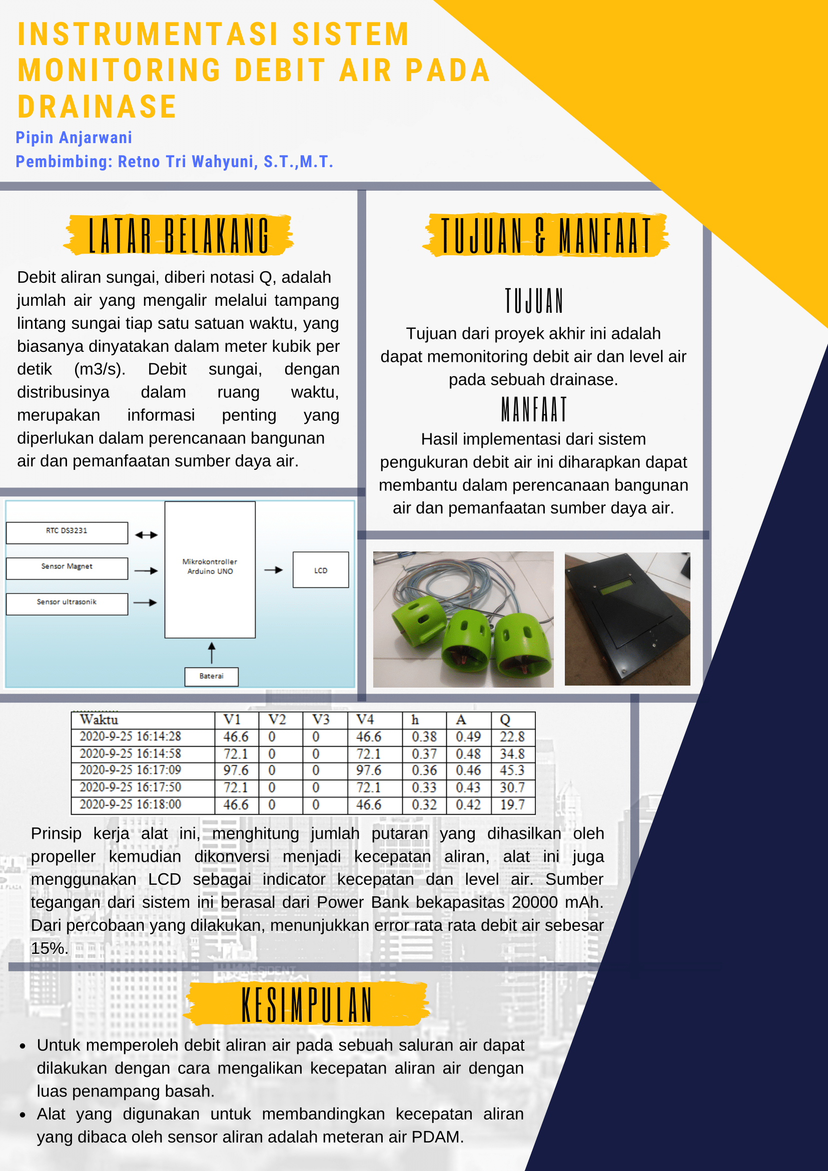 pengolah data sensor, hall-effect sensor A3144 sebagai pengukur debit air dan sensor ultrasonik sebagai pengukur level ketinggian air. Prinsip kerja alat ini, menghitung jumlah putaran yang dihasilkan oleh propeller kemudian dikonversi menjadi kecepatan aliran, alat ini juga menggunakan LCD sebagai indicator kecepatan dan level air. Sumber tegangan dari sistem ini berasal dari Power Bank bekapasitas 20000 mAh. Dari percobaan yang dilakukan, menunjukkan error rata rata debit air sebesar 15%.