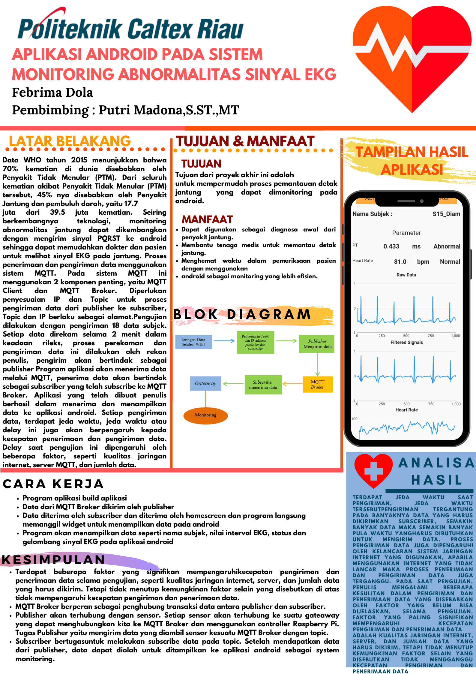 Data WHO tahun 2015 menunjukkan bahwa 70% kematian di dunia disebabkan oleh Penyakit Tidak Menular (PTM). Dari seluruh kematian akibat Penyakit Tidak Menular (PTM) tersebut, 45% nya disebabkan oleh Penyakit Jantung dan pembuluh darah, yaitu 17.7 juta dari 39.5 juta kematian. Seiring berkembangnya teknologi, monitoring abnormalitas jantung dapat dikembangkan dengan mengirim sinyal PQRST ke android sehingga dapat memudahkan dokter dan pasien untuk melihat sinyal EKG pada jantung. Proses penerimaan dan pengiriman data menggunakan sistem MQTT. Pada sistem MQTT ini menggunakan 2 komponen penting, yaitu MQTT Client dan MQTT Broker. Diperlukan penyesuaian IP dan Topic untuk proses pengiriman data dari publisher ke subscriber, Topic dan IP berlaku sebagai alamat.Pengujian dilakukan dengan pengiriman 18 data subjek. Setiap data direkam selama 2 menit dalam keadaan rileks, proses perekaman dan pengiriman data ini dilakukan oleh rekan penulis, pengirim akan bertindak sebagai publisher. Program aplikasi akan menerima data melalui MQTT, penerima data akan bertindak sebagai subscriber yang telah subscribe ke MQTT Broker. Aplikasi yang telah dibuat penulis berhasil dalam menerima dan menampilkan data ke aplikasi android. Setiap pengiriman data, terdapat jeda waktu, jeda waktu atau delay ini juga akan berpengaruh kepada kecepatan penerimaan dan pengiriman data. Delay saat pengujian ini dipengaruhi oleh beberapa faktor, seperti kualitas jaringan internet, server MQTT, dan jumlah data.
