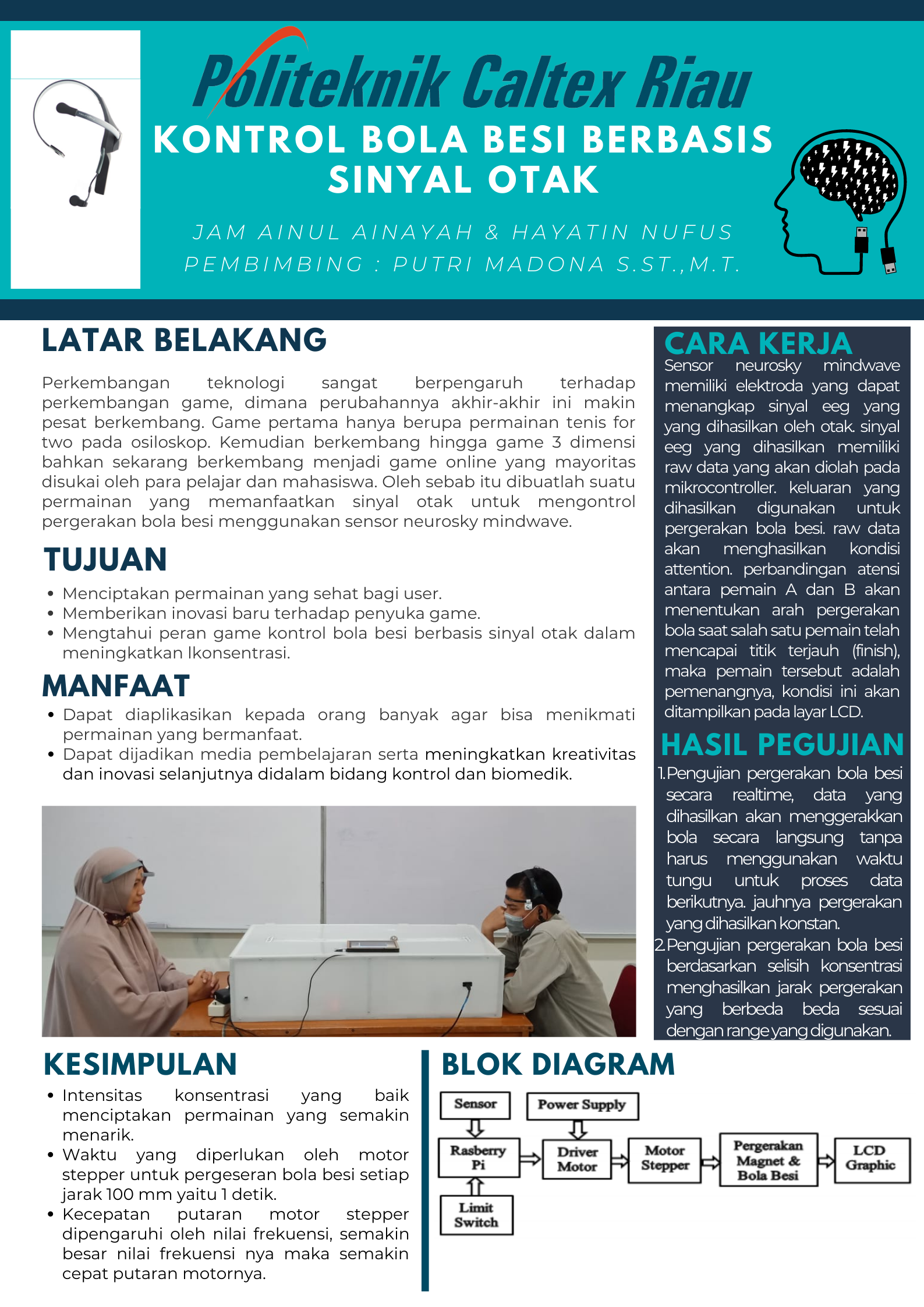 tive serta masalah lainnya. Terapi yang dilakukan berupa permainan yang mendapat interupsi dari sinyal otak. Hal ini bertujuan untuk melatih dan meningkatkan konsentrasi dan fokus seseorang. Pada proyek akhir ini akan membahas tentang pergerakan bola menggnakan sinyak otak (EEG). Aktifitas listrik pada otak user akan direkam dengan menggunakan sensor neursky mindwave, kemudian data tersebut akan diolah dan diakuisisi dengan menggunakan mikrokontroller Raspberry Pi. Hasil akhir pengolahan data tersebut akan menentukan arah pergerakan pada bola besi dan ditampilkan pada LCD. Sinyal otak didapat dengan sebuah sensor neurosky mindwave. output dari sensor ini adalah nilai attention. Nilai attention akan digunakan untuk pergerakan maju dan mundurnya bola besi. Hasil dari pengujian pergerakan bola besi berbasis sinyal otak ini menghasilkan pergerakan yang cukup baik. Hal ini dipengaruhi oleh atensi yang dihasilkan oleh pemain. Pergerakan yang terjadi secara realtime disebabkan oleh data dari masing-masing pemain yang langsung diproses dan dibandingkan sehingga menghasilkan pergerakan yang konstan. Intensitas atensi yang dihasilkan oleh masingmasing pemain akan menciptakan permainan yang semakin menarik.