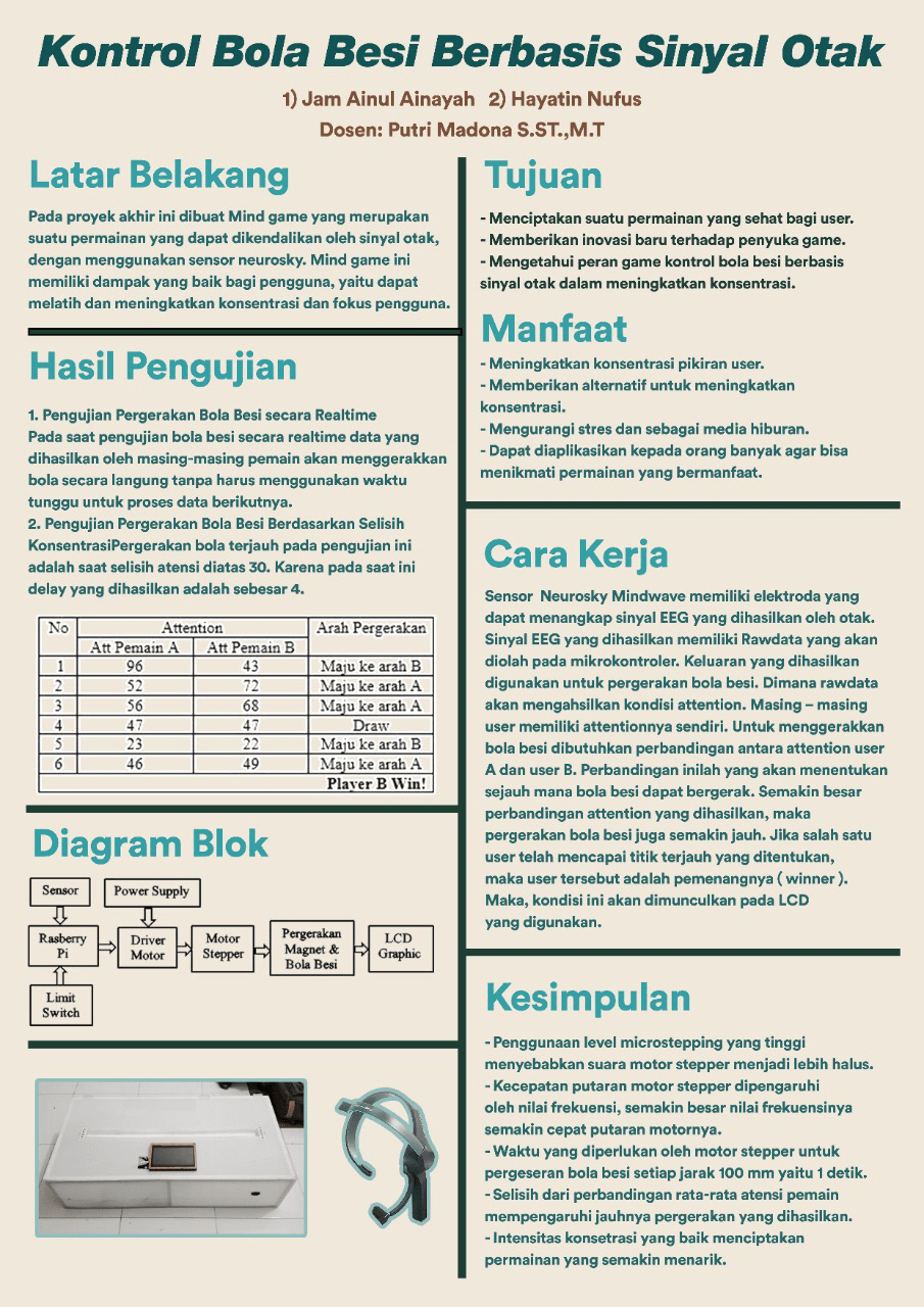 Mind Game merupakan suatu permainan yang menggunakan konsentrasi dan fokus untuk menggerakkan suatu bola. Mind Game diharapkan dapat membantu meningkatkan konsentrasi dan fokus pengguna. Sinyal otak atau EEG dimanfaatkan diberbagai bidang. Banyak orang atau lembaga yang memanfaatkan sinyal otak atau EEG untuk membantu orang berkebutuhan khusus sebagai media terapi. Contohnya saja untuk mengontrol pergerakan kursi roda, alat terapi otak untuk orang dengan gangguan konsentrasi, hyperactive serta masalah lainnya. Terapi yang dilakukan berupa permainan yang mendapat interupsi dari sinyal otak. Hal ini bertujuan untuk melatih dan meningkatkan konsentrasi dan fokus seseorang. Pada proyek akhir ini akan membahas tentang pergerakan bola menggunakan sinyal otak (EEG). Aktifitas listrik pada otak user akan direkam dengan menggunakan sensor neursky mindwave, kemudian data tersebut akan diolah dan diakuisisi dengan menggunakan mikrokontroller Raspberry Pi. Hasil akhir pengolahan data tersebut akan menentukan arah pergerakan pada bola besi dan ditampilkan pada LCD. Sinyal otak didapat dengan sebuah sensor neurosky mindwave output dari sensor ini adalah nilai attention. Nilai attention akan digunakan untuk pergerakan maju dan mundurnya bola besi. Hasil dari pengujian pergerakan bola besi berbasis sinyal otak ini menghasilkan pergerakan yang cukup baik. Hal ini dipengaruhi oleh atensi yang dihasilkan oleh pemain.