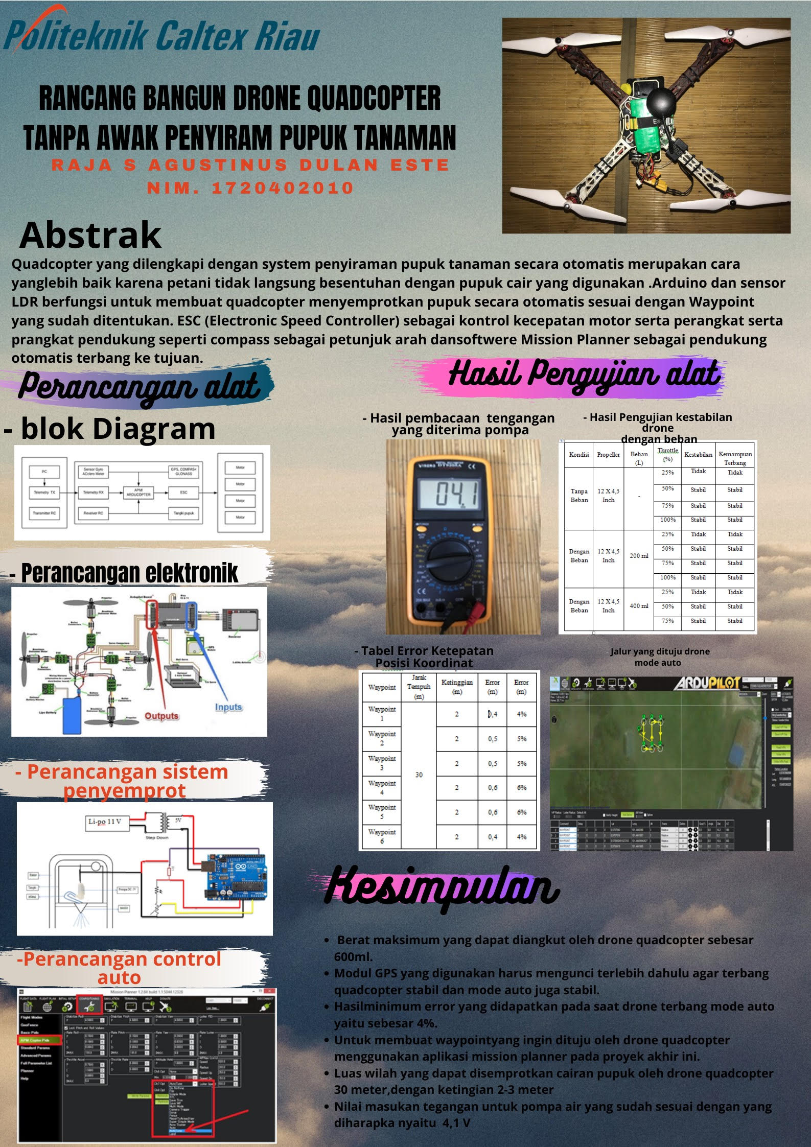 Quadcopter yang dilengkapi dengan system penyiraman pupuk tanaman secara otomatis merupakan cara yang lebih baik karena petani tidak langsung besentuhan dengan pupuk cair yang digunakan. Jika bersentuhan langsung terus menerus, maka dapat menyebabkan gatal-gatal terhadap kulit sampai dapat menyebabkan infeksi terhadap kulit. Quadcopter dilengkapi dengan sebuah motor pompa yang akan mengaktifkan system penyiraman pupuk denagan pengendalian dari remote control. Arduino dan sensor LDR berfungsi untuk membuat quadcopter menyemprotkan pupuk secara otomatis sesuai dengan Waypoint yang sudah ditentukan. Informasi yang diterima oleh modul receiver fs-ia6b tersebut akan diolah oleh AMP Pro yang nantinya akan mengontrol system qeadcopter. ESC (Electronic Speed Controller) sebagai kontrol kecepatan motor serta perangkat serta prangkat pendukung seperti compass sebagai petunjuk arah dan softwere Mission Planner sebagai pendukung otomatis terbang ke tujuan. Dimana yang seharusnya tepat menyemprotkan pupuk pada titik yang sudah ditentukan dengan adanya error maka penyemprotan dapat bergeser dari titik yang sudah ditentukan, pergeseran sebesar 0,2 – 0,5 meter. Quadcopter dapat mengangkat beban dengan stabil mulai dari 300-600 ml, dengan kapasitas baterai 5500 mAh 22,2 v. Quadcopter dapat terbang tanpa penambahan beban selama 10-15 menit. Penambahan beban pada quadcopter sebesar 600 ml maka dapat terbang selamat 7-8 menit.