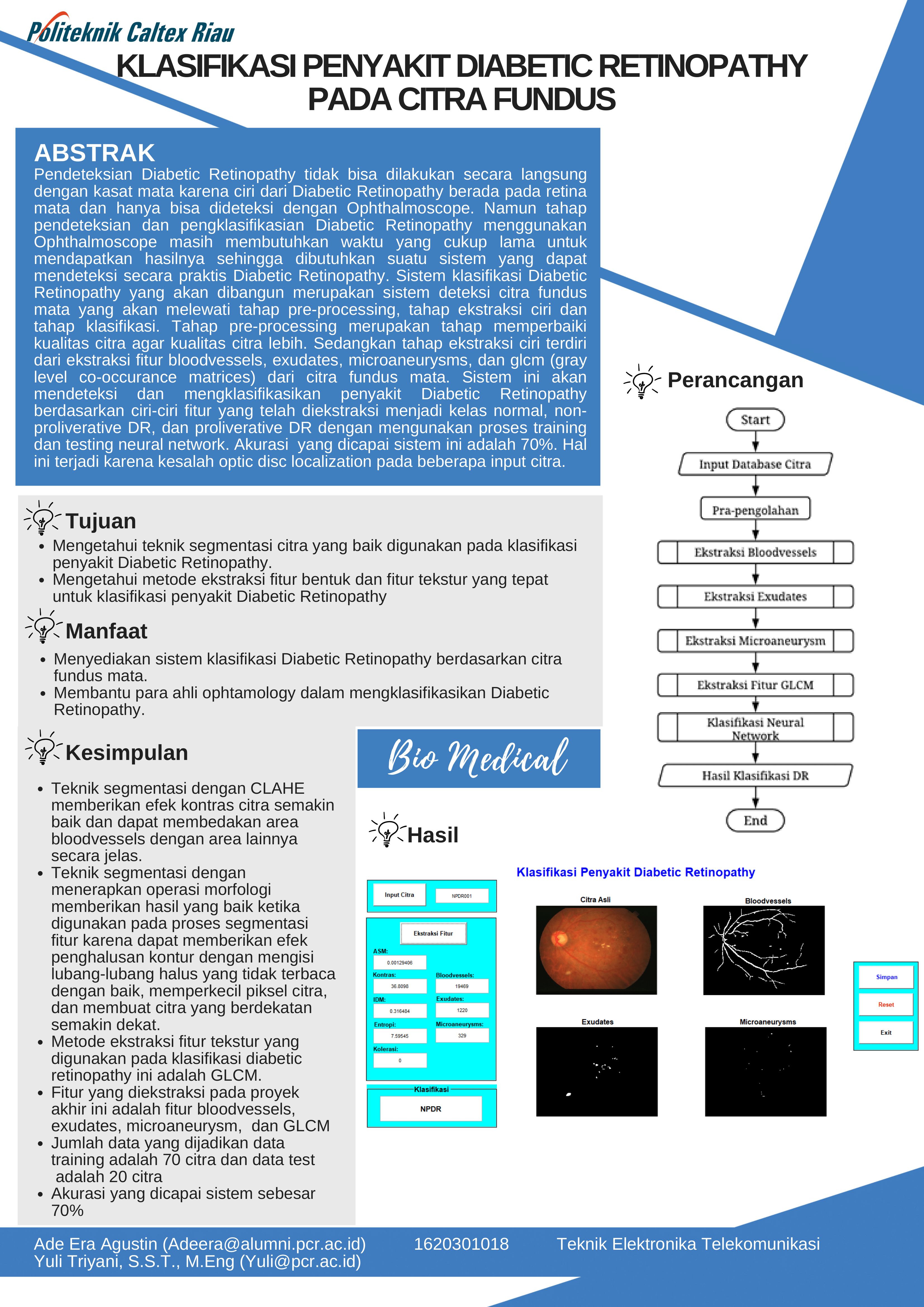 Diabetic Retinopathy (DR) merupakan komplikasi umum dari Diabetes melitus. Pendeteksian Diabetic Retinopathy tidak bisa dilakukan secara langsung dengan kasat mata karena ciri dari Diabetic Retinopathy berada pada retina mata dan hanya bisa dideteksi dengan Ophtalmoscope yang menghasilkan citra fundus. Namun tahap pendeteksian dan pengklasifikasian Diabetic Retinopathy menggunakan Ophtalmoscope masih membutuhkan waktu yang cukup lama untuk mendapatkan hasilnya sehingga dibutuhkan suatu sistem yang dapat mendeteksi secara praktis Diabetic Retinopathy. Sistem klasifikasi Diabetic Retinopathy yang akan dibangun merupakan sistem deteksi citra fundus mata yang akan melewati tahap pre-processing, tahap ekstraksi ciri dan tahap klasifikasi. Tahap pre-processing merupakan tahap memperbaiki kualitas citra agar kualitas citra lebih. Sedangkan tahap ekstraksi ciri terdiri dari ekstraksi fitur bloodvessels, exudates, microaneurysms, dan glcm (gray level co-occurance matrices) dari citra fundus mata. Sistem ini akan mendeteksi dan mengklasifikasikan penyakit Diabetic Retinopathy berdasarkan ciri-ciri fitur yang telah diekstraksi menjadi kelas normal, ¬non-proliverative DR, dan proliverative DR dengan mengunakan proses training dan testing neural network. Akurasi yang dicapai sistem ini adalah 70%. Hal ini terjadi karena kesalah optic disc localization pada beberapa input citra.