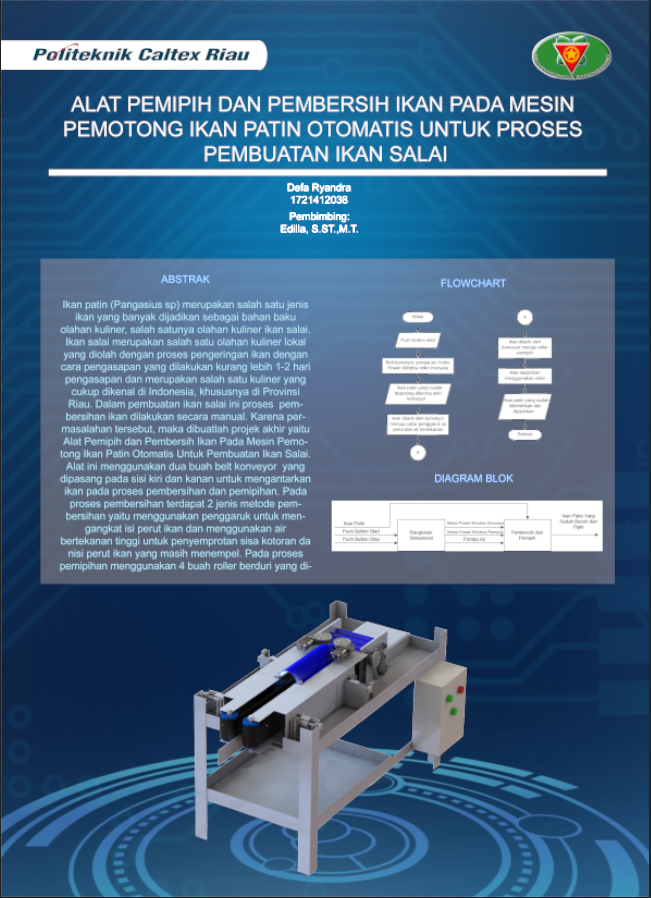 Ikan patin (Pangasius sp) merupakan salah satu jenis ikan yang banyak dijadikan sebagai bahan baku olahan kuliner, salah satunya olahan kuliner ikan salai. Ikan salai merupakan salah satu olahan kuliner lokal yang diolah dengan proses pengeringan ikan dengan cara pengasapan yang dilakukan kurang lebih 1-2 hari pengasapan dan merupakan salah satu kuliner yang cukup dikenal di Indonesia, khususnya di Provinsi Riau. Dalam pembuatan ikan salai ini proses pembersihan ikan dilakukan secara manual. Karena permasalahan tersebut, maka dibuatlah projek akhir yaitu Alat Pemipih dan Pembersih Ikan Pada Mesin Pemotong Ikan Patin Otomatis Untuk Pembuatan Ikan Salai. Alat ini menggunakan dua buah belt konveyor yang dipasang pada sisi kiri dan kanan untuk mengantarkan ikan pada proses pembersihan dan pemipihan. Pada proses pembersihan terdapat 2 jenis metode pembersihan yaitu menggunakan penggaruk untuk mengangkat isi perut ikan dan menggunakan air bertekanan tinggi untuk penyemprotan sisa kotoran da nisi perut ikan yang masih menempel. Pada proses pemipihan menggunakan 4 buah roller berduri yang dipasang berurutan dan memiliki ketinggian penyempitan yang bertingkat. Dari pengambilan data pembersihan ikan yang dilakukan didapatkan berat ideal ikan yang dapat dibersihkan sekitar 150 – 250 gram. Persentase tingkat kebersihan ikan didapat 70-80% dan persentase tingkat pemipihan didapat 70-80%. Waktu rata-rata proses keseluruhan pembersih dan pemipih 07,71 detik. Ikan yang dapat diproses sebenyak 7-8 ekor per menit.