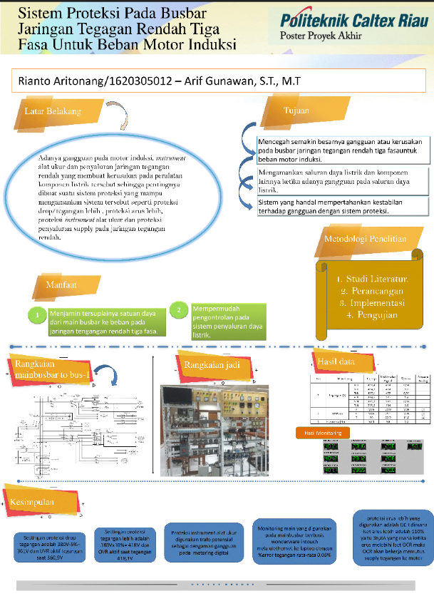 Adanya ganguan yang terjadi pada motor induksi, instrument alat ukur dan gangguan pada penyaluran tegangan, sehingga proyek ini dibuat untuk mengamankan gangguan pada motor induksi dari gangguan tegangan lebih, drop tegangan, arus lebih, gangguan pada instrument alat ukur dan gangguan penyaluran tegangan. Metode yang digunakan pada proyek akhir ini barupa sistem proteksi menggunakan over voltage relay, under voltage relay, over current relay, trafo potensial dan mccb pada jaringan tegangan rendah tiga fasa dan monitoring main busbar menggunakan wonderware intouch melalui ethernet. Adapun hasil yang ingin didapat dari sistem proteksi ini adalah mencegah semakin besarnya gangguan atau kerusakan pada busbar jaringan tegangan rendah tiga fasa untuk beban motor induksi, menjamin tersuplainya satuan daya dari main busbar ke beban pada jaringan tengangan rendah tiga fasa, dan mempermudah pengontrolan pada sistem penyaluran daya listrik. Adapun hasil pengujian yang didapat pada over voltage relay (OVR) dengan settingan 418V dan bekerja atau trip ketika dialiri tegangan 418,1V dengan perbandingan hasil pengukuran mulltimeter digital dengan hasil pengukuran monitoring dilaptop didapat error persennya adalah 0,76% sementara untuk under voltage relay disetting 361V dan trip ketika dialiri tegangan 360,9V sehingga mengamankan motor induksi dari gangguan drop tegangan dengan perbandingan yang didapat pada pengukuran multimeter dengan monitoring dilaptop didapat error persennya sebesar 0,3%.