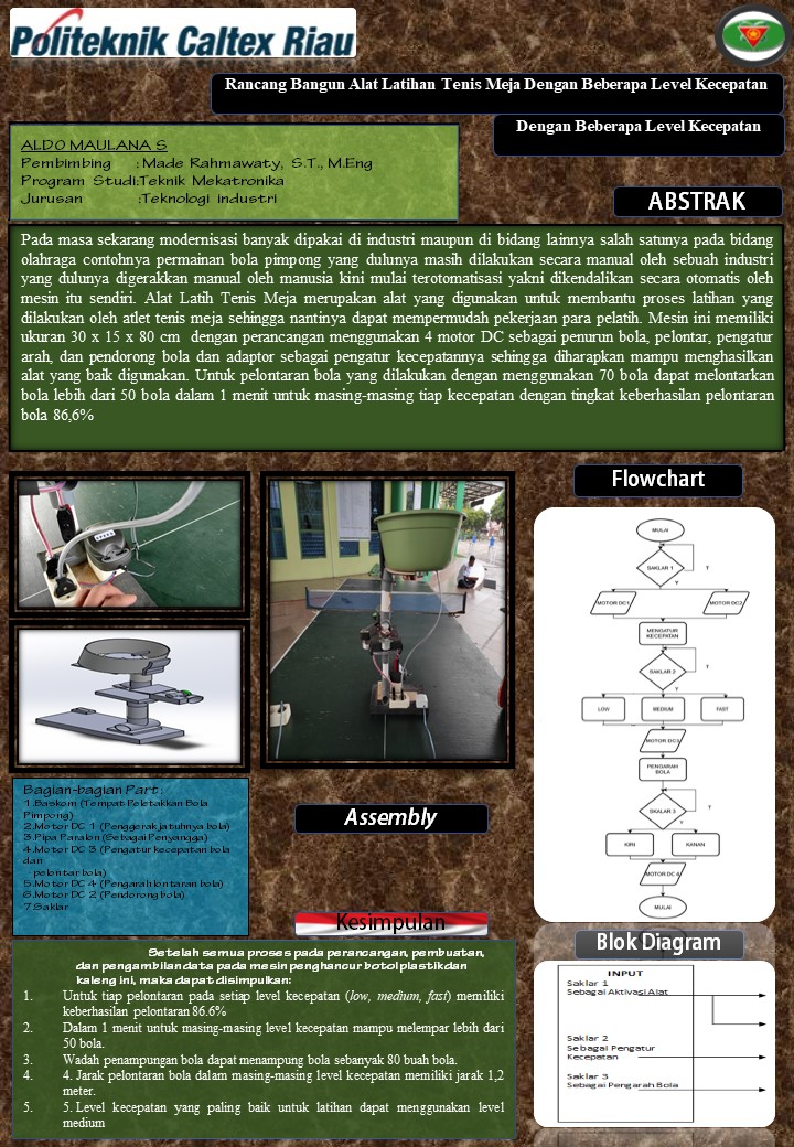 Pada masa sekarang modernisasi banyak dipakai di industri maupun di bidang lainnya salah satunya pada bidang olahraga contohnya permainan bola pimpong yang dulunya masih dilakukan secara manual oleh sebuah industri yang dulunya digerakkan manual oleh manusia kini mulai terotomatisasi yakni dikendalikan secara otomatis oleh mesin itu sendiri. Alat Latih Tenis Meja merupakan alat yang digunakan untuk membantu proses latihan yang dilakukan oleh atlet tenis meja sehingga nantinya dapat mempermudah pekerjaan para pelatih. Mesin ini memiliki ukuran 30 x 15 x 80 cm dengan perancangan menggunakan 4 motor DC sebagai penurun bola, pelontar, pengatur arah, dan pendorong bola dan adaptor sebagai pengatur kecepatannya sehingga diharapkan mampu menghasilkan alat yang baik digunakan. Untuk pelontaran bola yang dilakukan dengan menggunakan 70 bola dapat melontarkan bola lebih dari 50 bola dalam 1 menit untuk masing-masing tiap kecepatan dengan tingkat keberhasilan pelontaran bola 86,6%
