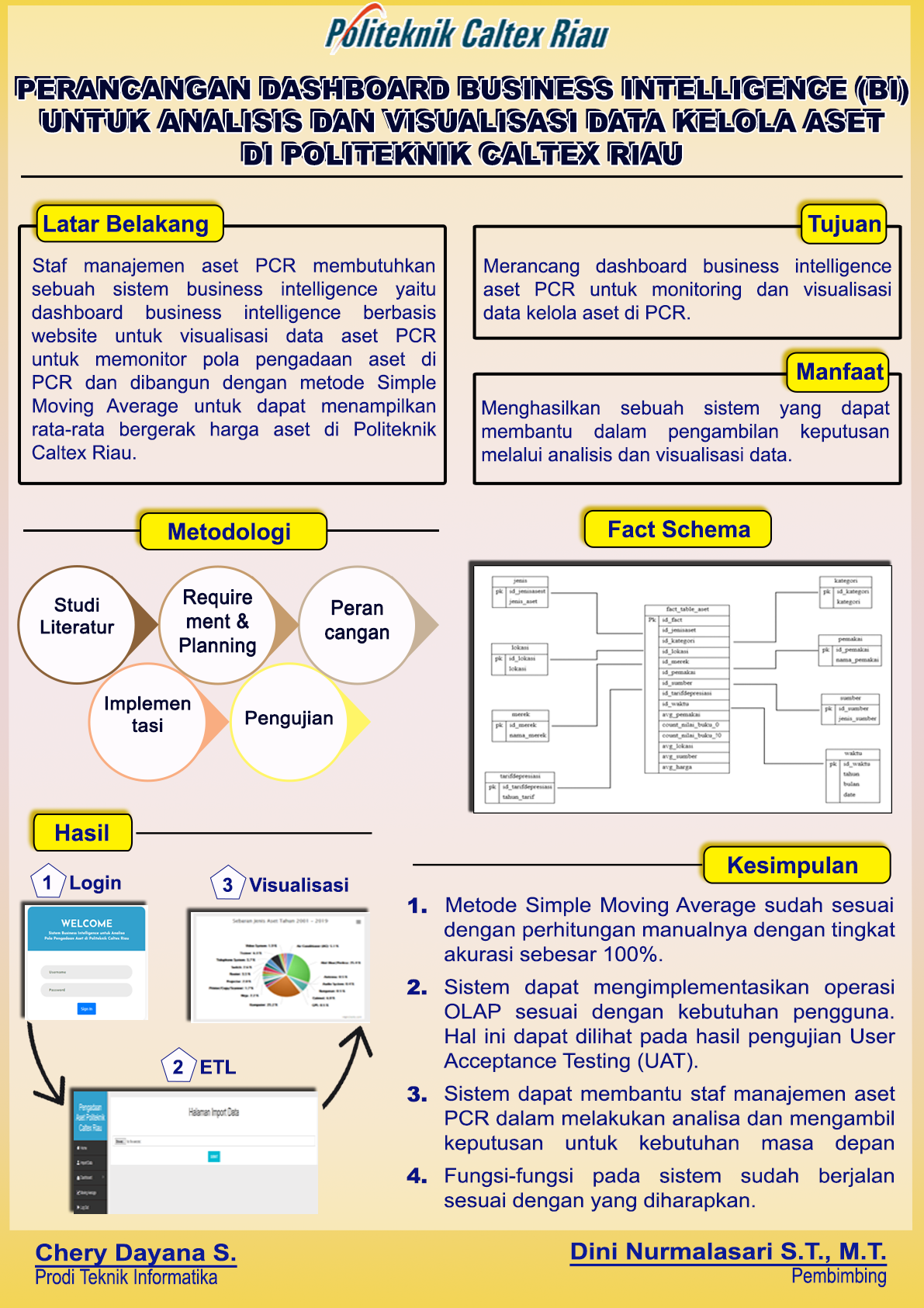 Aset merupakan segala sesuatu barang atau benda yang dimiliki oleh suatu instansi atau perusahaan yang memiliki nilai untuk menunjang kegiatan bisnisnya. Staf manajemen aset adalah pihak yang berperan mengelola pengadaan aset di Politeknik Caltex Riau. Saat ini monitroring masih dilakukan dengan cara memeriksa satu per satu data aset melalui system informasi kelola aset. Kendalanya adalah dikhawatirkan monitoring tidak dilakukan secara menyeluruh dan memerlukan waktu yang banyak. Selain itu, belum ada media untuk membantu proses analisis seperti tidak menampilkan grafik untuk visualisasi data aset dan pengambilan keputusan untuk masa depan. Oleh karena itu solusi dari permasalahan tersebut adalah dibangun sebuah sistem visualisasi data aset dengan Business Intelligence yang dapat membantu staf manajemen aset dalam menganalisa data aset di PCR. Visualisasi data ditampilkan dalam bentuk grafik dan dirancang menggunakan bahasa pemrograman PHP dan MySQL sebagai DBMS nya. Selain visualisasi, sistem ini juga dibangun dengan menggunakan metode peramalan Simple Moving Average untuk menentukan rata-rata bergerak tunggal harga aset di Politeknik Caltex Riau. Rata-rata bergerak harga aset juga disajikan dalam bentuk grafik untuk melihat perbandingan antara harga aset actual dengan harga aset perkiraan pada periode dan tahun tertentu dalam bentuk grafik. Berdasarkan hasil pengujian kuesioner UAT menunjukkan bahwa sistem sudah dapat memberikan manfaat kepada staf manajemen aset dengan persentase 80%. Hasil pengujian fungsional sistem menunjukkan bahwa sistem ini telah berhasil dibangun dan berjalan dengan baik.