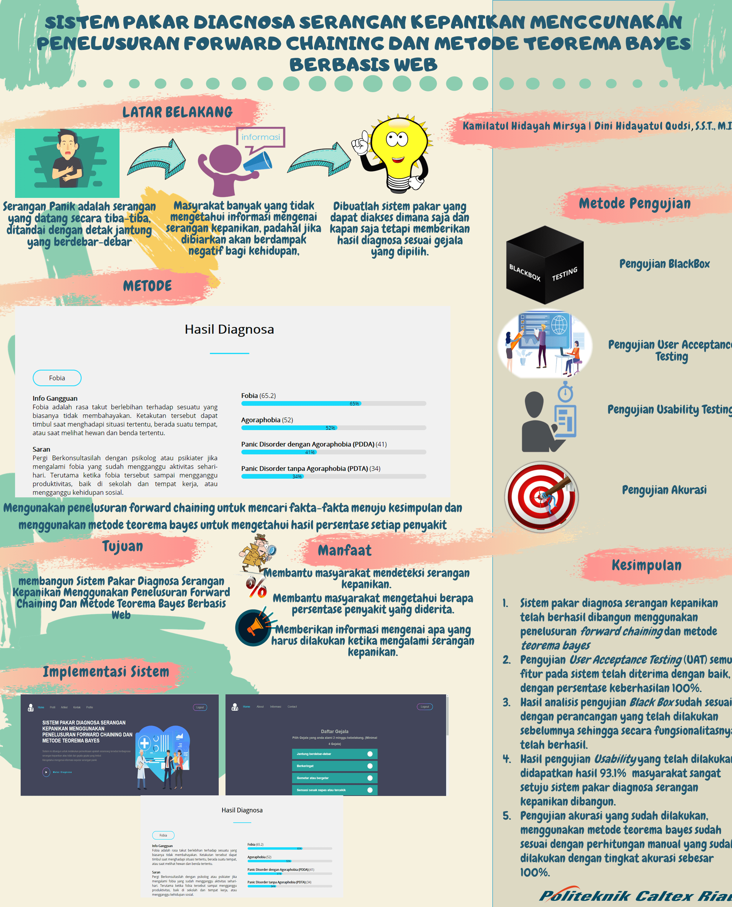 Panic Attack atau serangan kepanikan merupakan gangguan kecamasan dan ketakutan yang berlebihan. Serangan panik terjadi dengan sangat tiba-tiba tanpa alasan yang jelas Serangan panik terjadi jika jantung berdebar keras dan sulitnya untuk bisa bernafas. Penyebab serangan panik dapat dipicu oleh kejadian traumatis masa lalu, masalah kesehatan maupun memiliki fobia atas situasi yang menjadi pemicu gangguan kepanikan. Sistem pakar ini menggunakan penelusuran forward chaining. Penelusuran ini melakukan pencarian yang dimulai dari sekumpulan fakta-fakta yang cocok dengan dugaan/hipotesa yang menuju kesimpulan. Dan memanfaatkan Teorema Bayes sebagai metode pengambilan keputusan. Tujuan dari pembuatan sistem pakar ini adalah untuk memeriksa apakah seseorang tersebut terdiagnosa serangan kepanikan atau tidak dari gejala-gejala yang timbul dan juga mengetahui bagaimana cara menolong orang yang mengalami serangan kepanikan tanpa harus menemui seorang psikater maupun psikolog. Setelah dilakukan pengujian blackbox dapat disimpulkan bahwa sistem sudah dapat berjalan sesuai dengan yang diharapkan. Bedasarkan pengujian User Acceptance Testing (UAT), dihasilkan bahwa semua fitur pada sistem telah diimplementasikan dan diterima dengan baik. Penentuan sampel dalam melakukan pengujian usability ini menggunakan rumus slovin dengan tingkat kesalahan sebesar 10% dan jumlah sampel sebanyak 17 responden dengan total hasil sebesar 93,1% bahwa pengguna sangat setuju sistem ini dibangun. Dan juga sudah dilakukan pengujian akurasi didapatkan tingkat akurasi sebesar 100%.