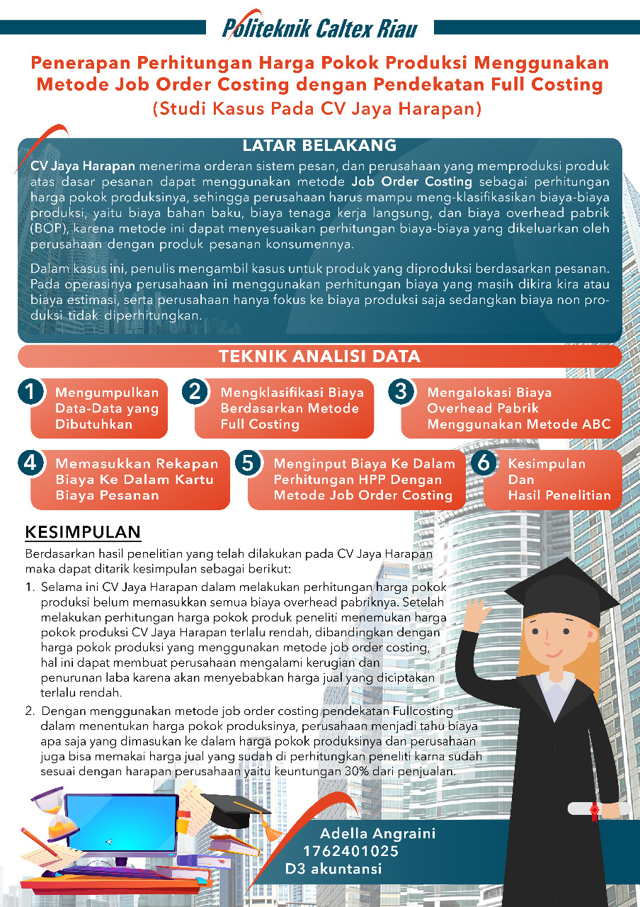 Tujuan dari penelitian ini yaitu perhitungan harga pokok produksi berdasarkan metode Job Order Costing dengan pendekatan biaya full costing dan untuk mengalokasi biaya mengunakan tingkat aktivitas dan biaya pemicu pada CV Jaya Harapan. Penelitian ini merupakan penelitian deskriptif kuantitatif, metode pengumpulan data yang digunakan dalam penelitian ini adalah dokumentasi dan wawancara. untuk menghitung biaya overhead pabrik nya peneliti mengambil metode activity based costing karena dengan metode ini memberikan informasi yang lebih rinci tentang aktivitas yang menimbulkan biaya. Dari hasil penelitian, semua produk yang mengalami undercost. Hal ini diakibatkan perusahaan tidak memasukan biaya overhead pabrik. Sedangkan menurut perhitungan job order costing method sudah memperhitungkan seluruh biaya yang dikeluarkan dan dapat mengidentifikasikan biaya bahan baku apa saja yang bertambah sesuai dengan pesanan yang dibutuhkan sehingga harga pokok produksi yang dihasilkan lebih tepat.