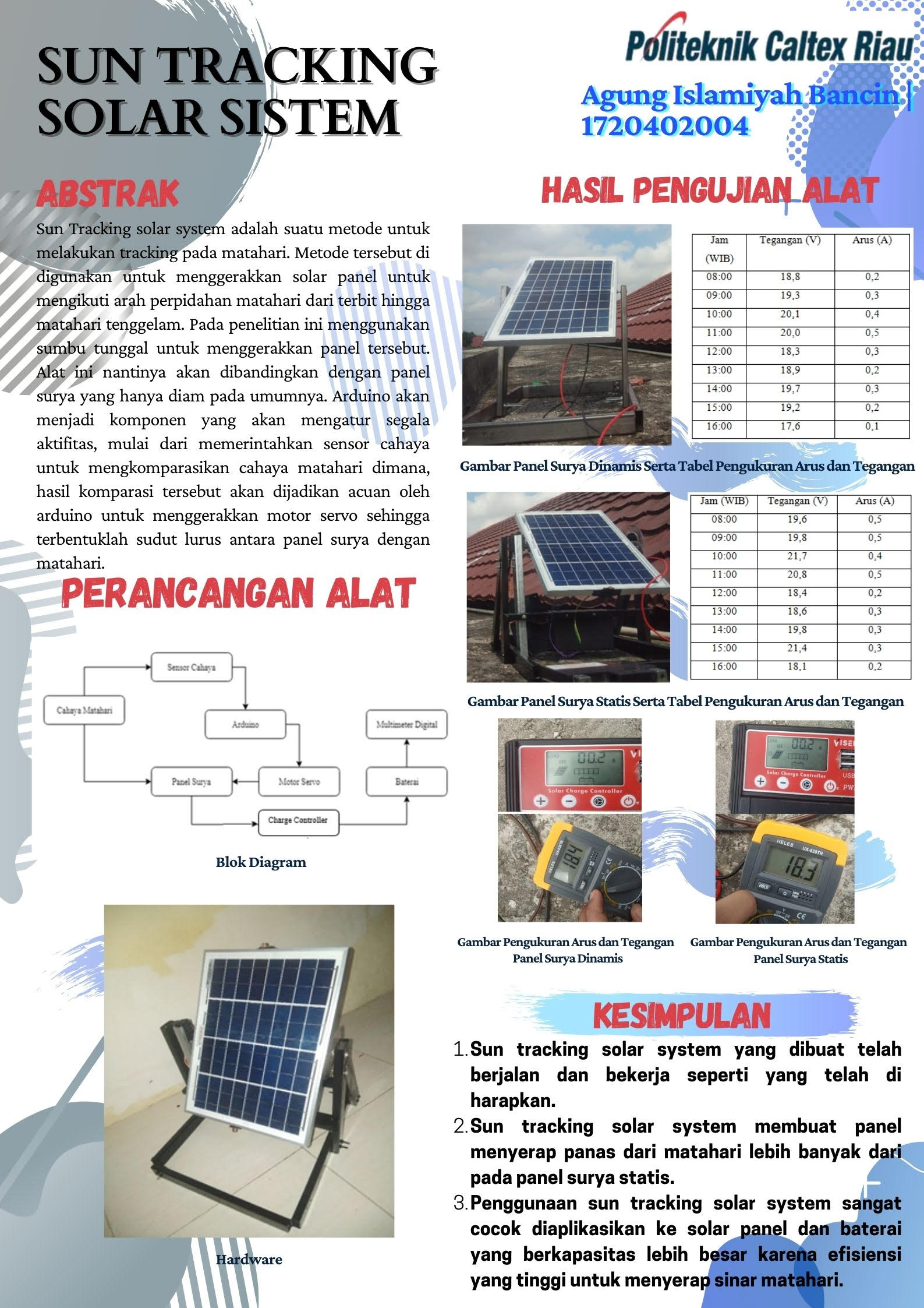 Sun Tracking solar system adalah suatu metode untuk melakukan tracking pada matahari. Metode tersebut di digunakan untuk menggerakkan solar panel untuk mengikuti arah perpidahan matahari dari terbit hingga matahari tenggelam. Pada penelitian ini menggunakan sumbu tunggal untuk menggerakkan panel tersebut. Alat ini nantinya akan dibandingkan dengan panel surya yang hanya diam pada umumnya. Arduino akan menjadi komponen yang akan mengatur segala aktifitas, mulai dari memerintahkan sensor cahaya untuk mengkomparasikan cahaya matahari dimana, hasil komparasi tersebut akan dijadikan acuan oleh arduino untuk menggerakkan motor servo sehingga terbentuklah sudut lurus antara panel surya dengan matahari.