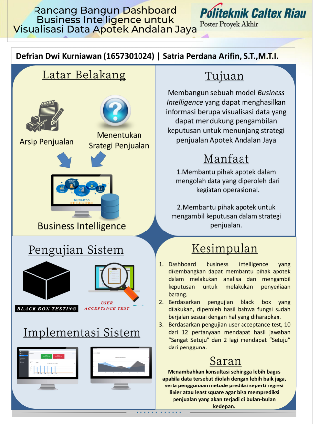 Apotek Andalan Jaya merupakan usaha yang bergerak dibidang kesehatan yang berlokasi di Rumbai, Pekanbaru. Data operasional apotek masih dicatat secara manual dan hanya dijadikan sebagai arsip. Data tersebut tidak dikembangkan lagi untuk memperoleh pengetahuan lebih lanjut, yang mana seharusnya data tersebut bisa diolah menjadi informasi yang berguna untuk pengambilan keputusan. Penelitian ini bertujuan untuk menganalisis data-data keluar masuk barang menggunakan teknologi Business Intelligence serta implementasi metode four step Kimball untuk pemodelan dimensi. Teknologi BI ini merupakan teknik dan alat untuk mentransformasi data mentah menjadi informasi yang berguna untuk analisa bisnis serta dapat menangani data dalam jumlah yang besar untuk membantu identifikasi dan mengembangkan strategi bisnis. Implementasi yang dilakukan berupa pengelolaan data historikal apotek yang akan ditampilkan dalam bentuk strategic dashboard untuk keperluan pengambilan keputusan strategis manajemen pada apotek tersebut. Visualisasi data yang dihasilkan berupa column-chart dan grafik chart. Sistem ini dirancang dengan bahasa pemograman PHP dan MySQL sebagai DBMS-nya. Sistem ini diuji dengan menggunakan pengujian black box dan user acceptance test (UAT) sehingga dapat mengetahui tingkat kepuasan pengguna terhadap sistem. Berdasarkan pengujian user acceptance test (UAT) yang telah dilakukan menunjukkan bahwa 96% sistem yang telah dibangun sudah dapat diterima oleh pengguna dan dapat membantu pengambilan keputusan manajemen apotek.