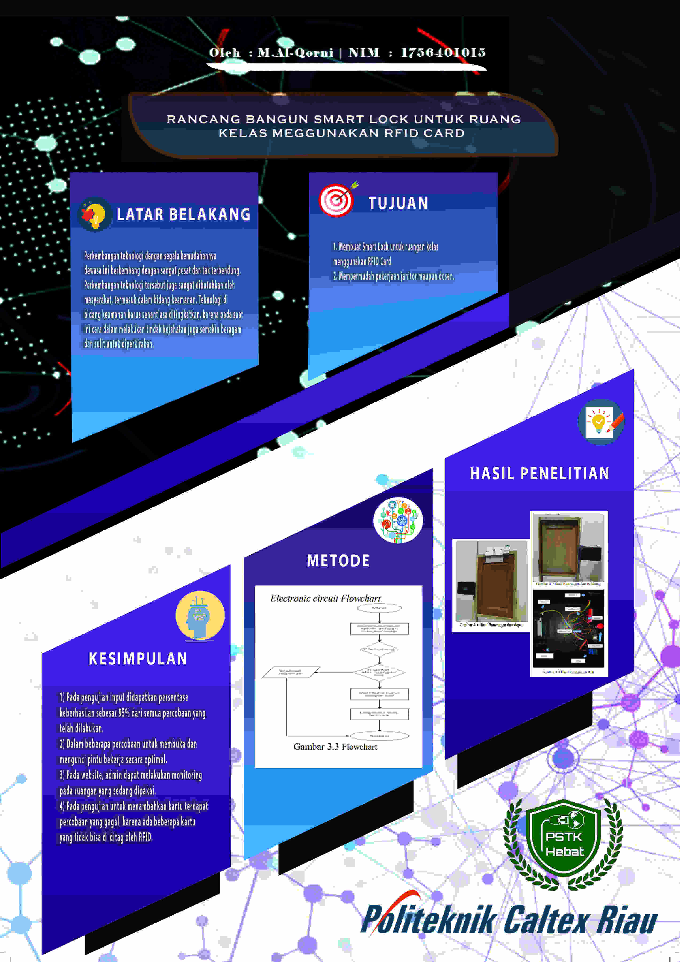 Pada ruangan perkuliahan Politeknik Caltex Riau, pembukaan pintu masih menggunakan cara yang manual yaitu masih menggunakan kunci biasa. Hal ini kurang efisien karena dosen harus mengambil kunci terlebih dahulu ke BAAK, sehingga menyebabkan durasi pengambilan kunci yang terlalu lama dikarenakan gedung PCR bertingkat. Khususnya janitor, kondisi ini sangat merepotkan dalam membawa kunci yang sangat banyak, karena pintu kuncinya berbeda-beda. Maka dibuat sebuah alat untuk mengatasi masalah tersebut yaitu sistem pintu pintar menggunakan teknologi "RFID" yang diimplmentasikan pada kelas sesuai jadwal perkuliahan. Sistem pintu pintar ini menggunakan Arduino Uno sebagai mikrokontroler, RFID sebagai penghubung ke Magnetik Lock, Magnetik Lock sebagai penahan pintu, UPS sebagai daya cadangan ESP 8266 sebagai penghubung antara arduino ke web dan web sebagai antarmuka pengguna. Hasil dari penelitian ini adalah dapat meringankan pekerjaan pada bidang sarana dan prasarana di Politeknik Caltex Riau, dan Biro Administrasi Akademik dan Kemahasiswaan sebagai admin yang dapat memonitoring ruangan mana saja yang sedang dipakai serta dapat admin dapat mengetahui keterangan pemakaian ruangan tersebut.