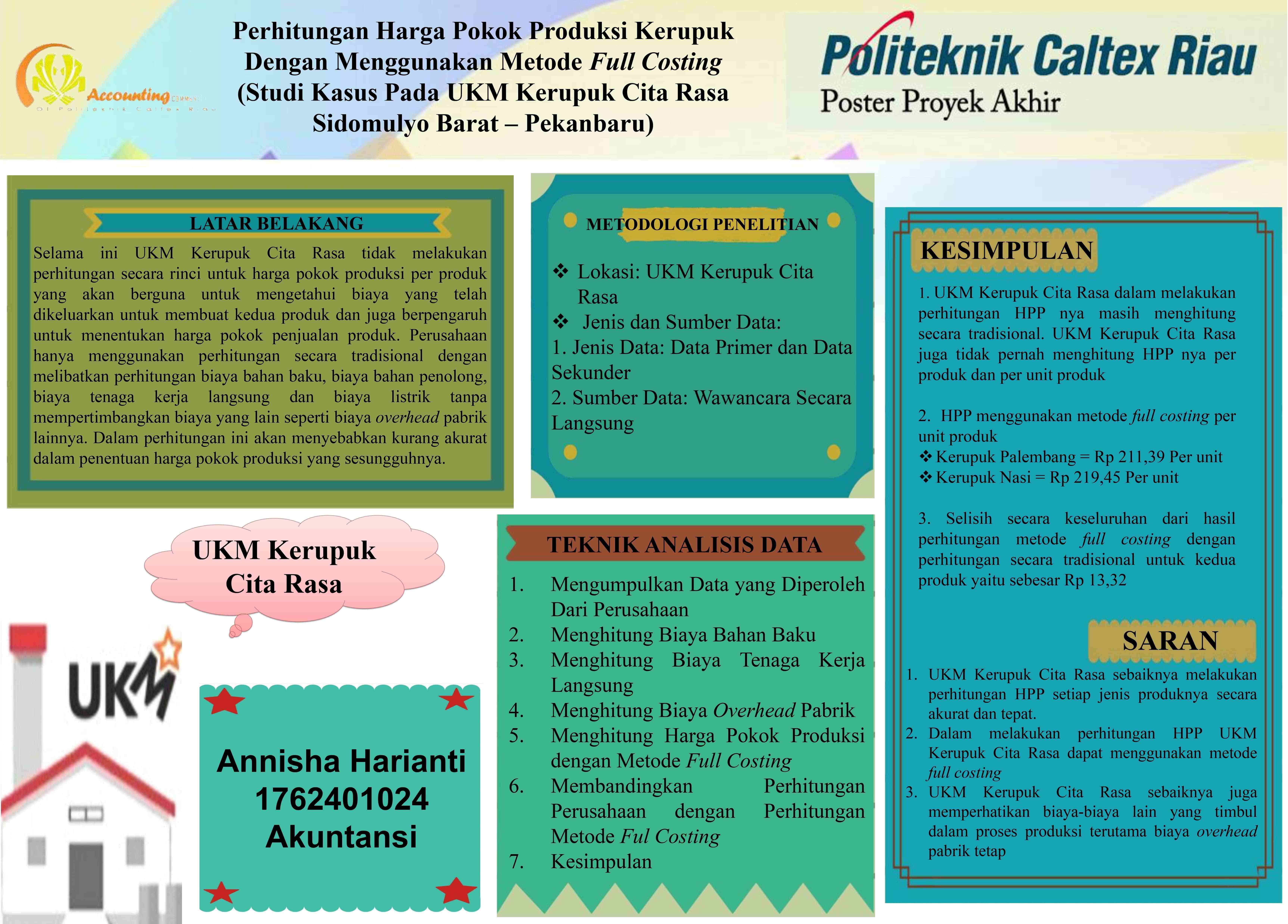 Penelitian tugas akhir ini dilakukan pada UKM Kerupuk Cita Rasa yaitu perusahaan yang bergerak dalam bidang makanan ringan yaitu kerupuk Palembang dan kerupuk nasi. Penelitian ini dilakukan untuk mengetahui perhitungan harga pokok produksi dengan menggunakan metode full costing dan mengetahui perbedaan perhitungan harga pokok produksi berdasarkan UKM Kerupuk Cita Rasa dengan perhitungan harga pokok produksi menggunakan metode full costing. Berdasarkan hasil penelitian, setelah dilakukan perhitungan harga pokok produksi dengan menggunakan metode full costing terdapat adanya perbedaan dengan perhitungan yang dilakukan berdasarkan perusahaan. Selisih perhitungan harga pokok produksi berdasarkan perusahaan dengan metode full costing per unit produk adalah sebesar Rp 9,90 untuk kerupuk Palembang dan Rp 3,42 untuk kerupuk nasi. Sedangkan secara keseluruhan perbedaan antara perhitungan berdasarkan perusahaan dengan perhitungan menggunakan metode full costing adalah sebesar Rp 13,32 per unit produk. Hal ini disebabkan karena pembebanan biaya overhead pada masing – masing produk lebih rinci. Perhitungan harga pokok produksi menurut perusahaan tidak memisahkan harga pokok produksi per produk, sedangkan perhitungan harga pokok produksi menggunakan metode full costing memisahkan harga pokok produksi masing - masing produk.