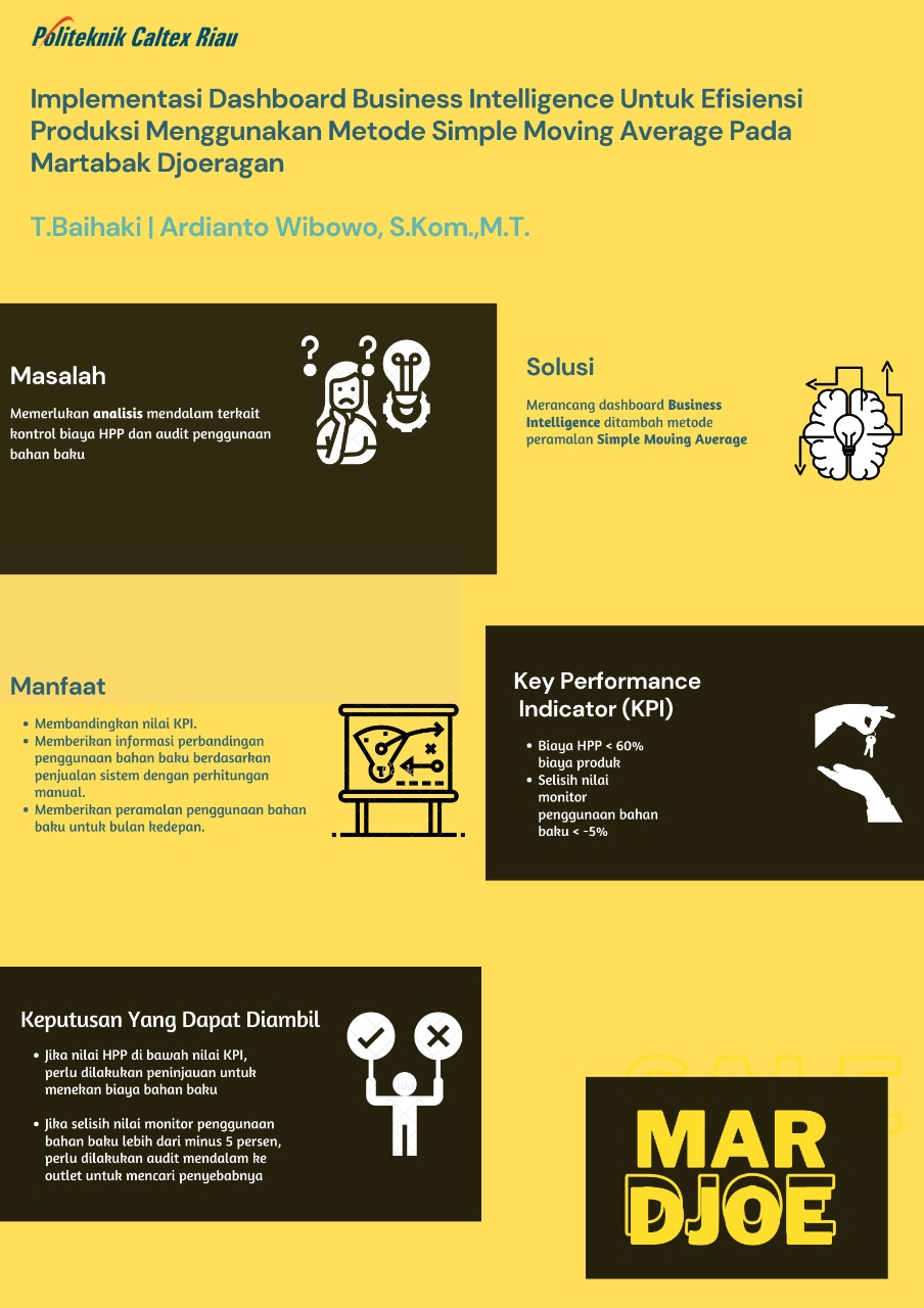 Martabak Djoeragan merupakan suatu usaha mikro kecil menengah (UMKM) yang bergerak pada bisnis kuliner. Dalam operasionalnya manajemen telah menggunakan teknologi informasi seperti penggunaan sistem point of sales (POS). Untuk menganalisis data yang tidak bisa dilakukan melalui sistem POS, maka manajemen menggunakan Microsoft Excel sebagai alternatif. Namun terdapat permasalahan yang belum dengan efektif terjawabkan yaitu terkait monitoring penggunaan bahan baku dalam produksi martabak. Sering kali terjadi perbedaan angka aktual dilapangan dengan angka yang ada di sistem. Perbedaan angka cukup berpengaruh terhadap target yang ingin dicapai manajemen. Penelitian ini bertujuan untuk menganalisis data bahan baku, data penjualan, dan data produksi menggunakan metode Business Intelligence (BI). BI sendiri adalah sekumpulan teknik dan alat untuk mentransformasikan dari data mentah menjadi informasi yang berguna dan bermakna untuk tujuan bisnis. Pada implementasinya dengan bantuan metode BI manajemen bisa mendapatkan laporan terkait efisiensi produksi berdasarkan penggunaan bahan baku dan biaya yang telah digunakan dalam produksi. Selain adanya analisis BI, pada penelitian ini juga menerapkan metode peramalan untuk memprediksi penggunaan bahan baku kedepannya menggunakan metode simple moving average dengan melihat pergerakan data selama tiga bulan terakhir. Sehingga dengan diimplementasikannya sistem ini telah membantu manajemen dalam mengambil keputusan bisnis terkait operasional maupun strategis untuk keperluan produksi.